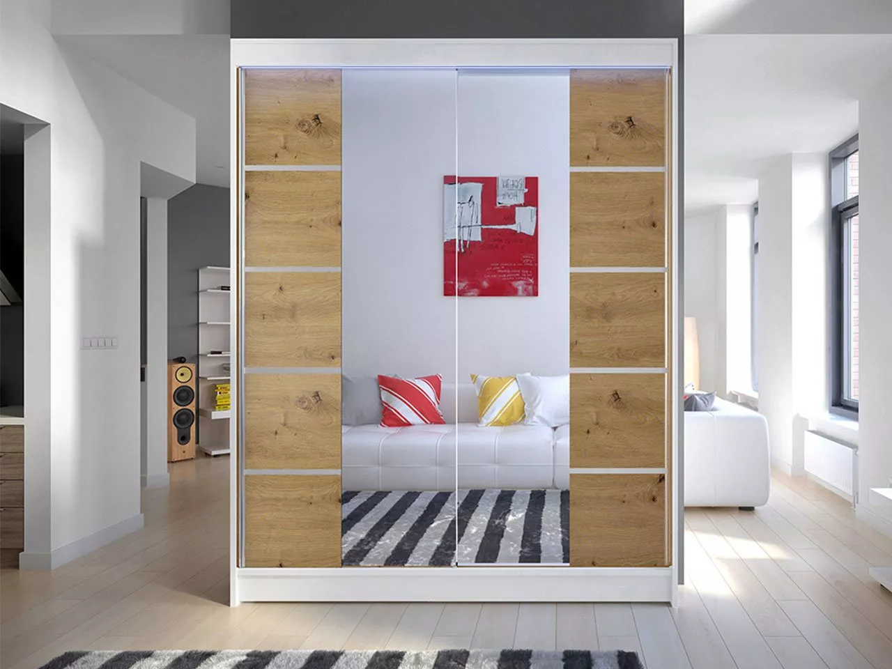 Šatní skříň s posuvnými dveřmi PIRITU 5 je vyrobena z kvalitních komponentů, které zaručují její stabilitu a odolnost. Vnitřek skříně je rozdělen do praktických zón, které napomáhají uspořádání. Součástí skříně je praktické zrcadlo a RGB LED osvětlení.