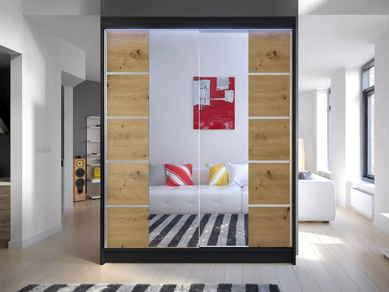 Šatní skříň s posuvnými dveřmi PIRITU 5 je vyrobena z kvalitních komponentů, které zaručují její stabilitu a odolnost. Vnitřek skříně je rozdělen do praktických zón, které napomáhají uspořádání. Součástí skříně je praktické zrcadlo a RGB LED osvětlení.