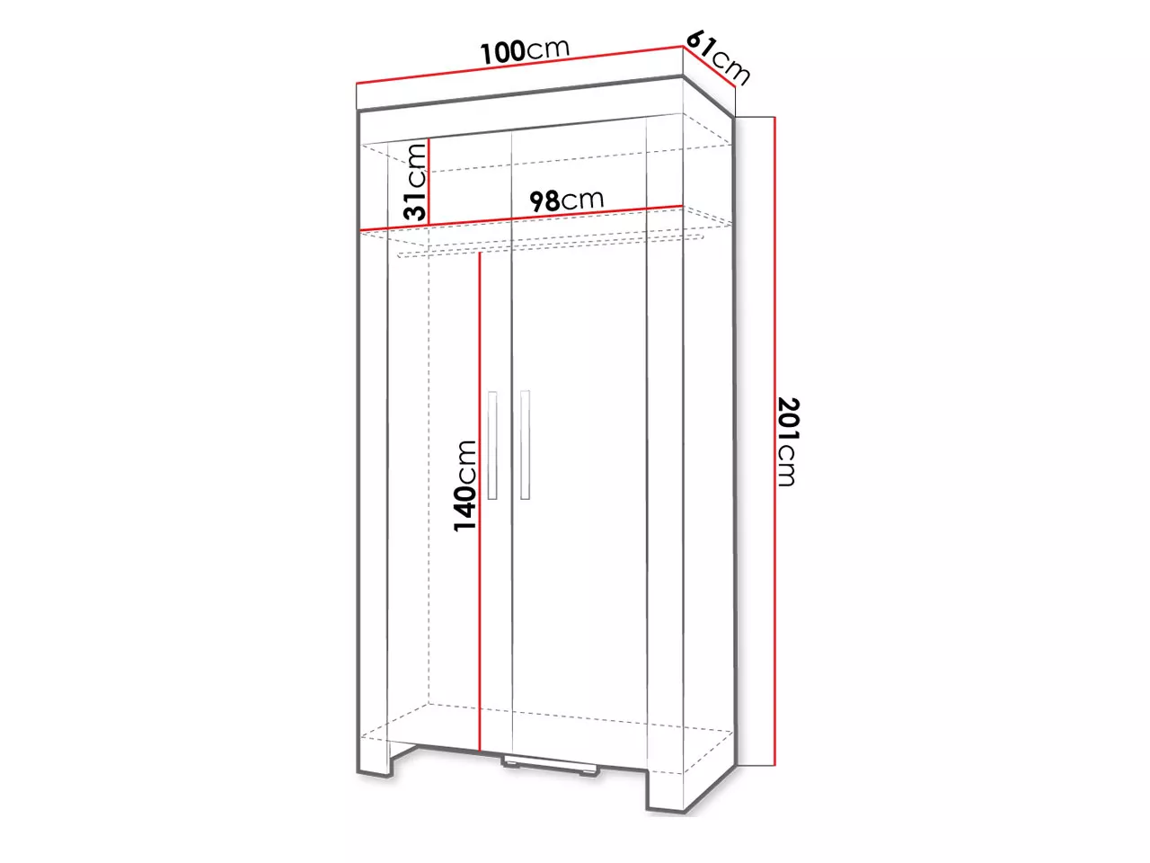 Dvoudveřová skříň s šatní tyčí TAKA je vhodná pro umístění do ložnice či předsíně pro uložení svrchního oblečení. Spodní a horní police jsou perfektním místem pro boty či jiné doplňky.
