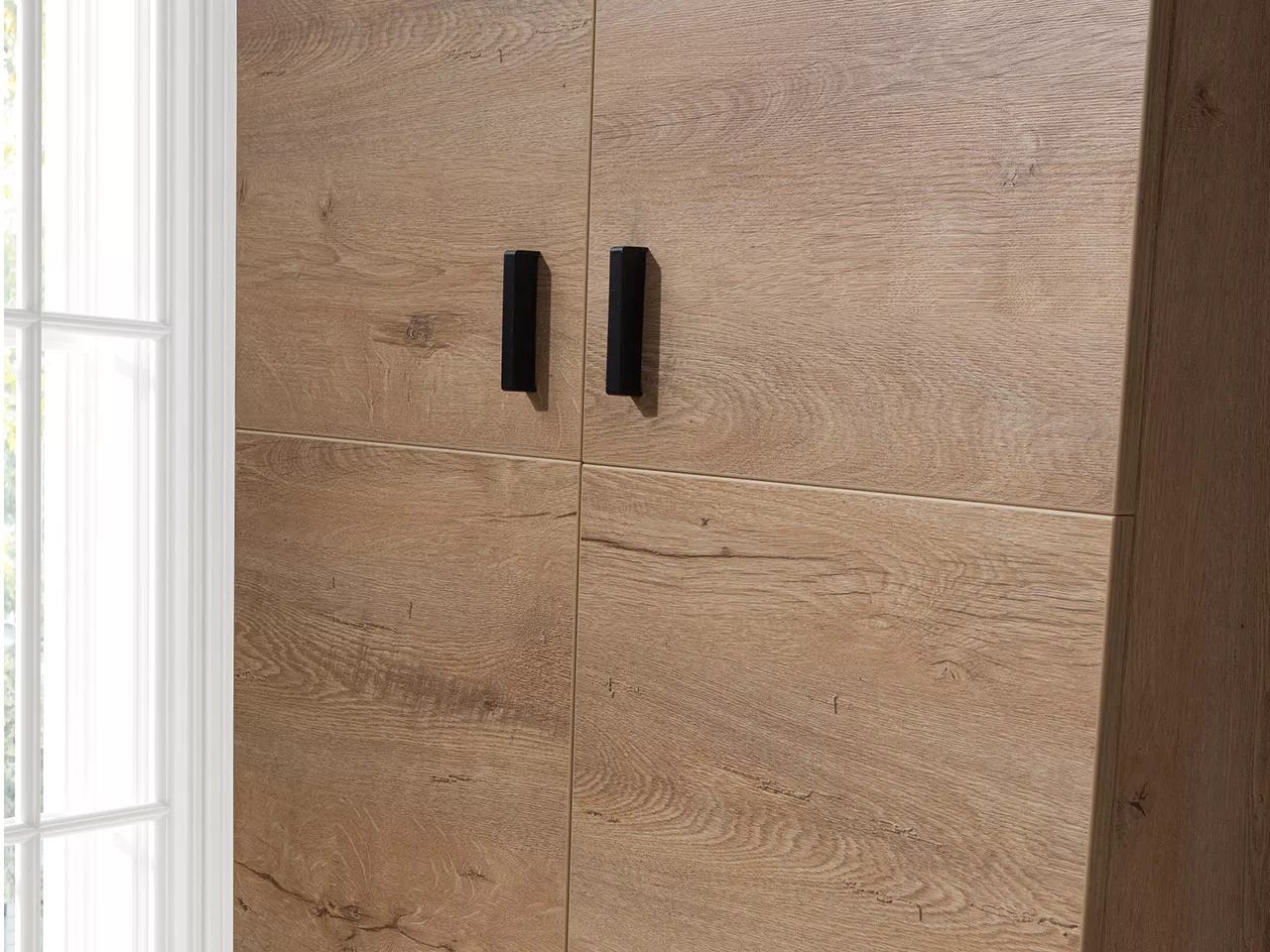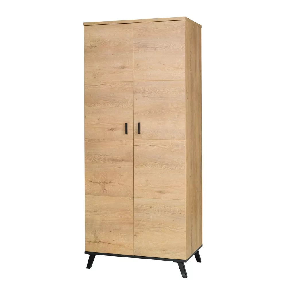 Dvoudveřová šatní skříň YUNA se vyznačuje nadčasovými barvami, které imitují dekor přírodního dřeva a vysokými nožkami, díky čemuž získává interiér příznivý dojem prostornosti a optického zvětšení. Vnitřní prostor tvoří hluboká police a šatní tyč.