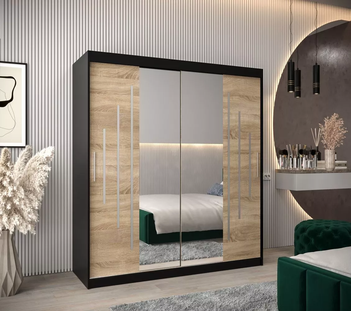 Šatní skříň se zrcadlem EWELINA - šířka 180 cm, černá / dub sonoma