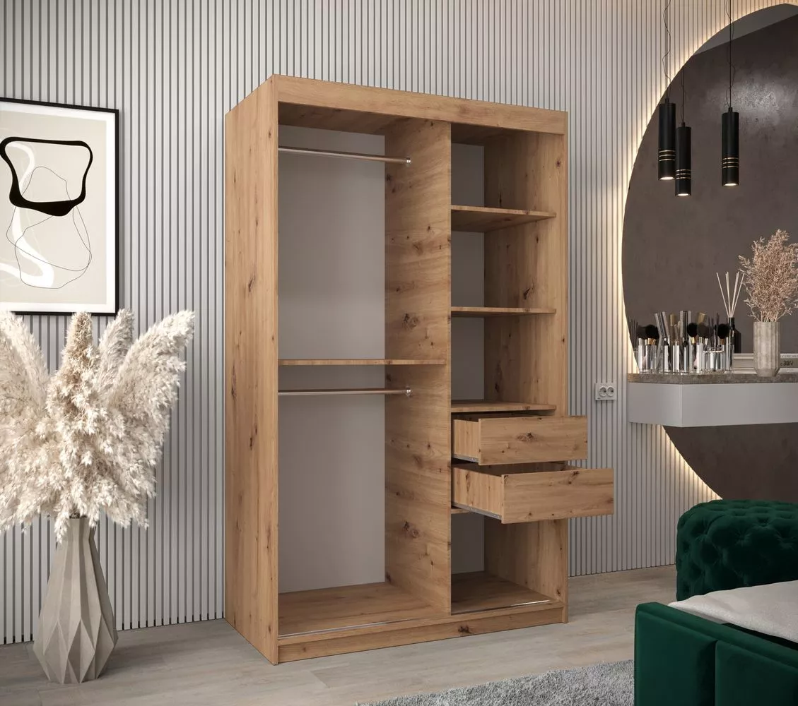 Součástí skříně je 5 polic a 2 šatní tyče. Šuplíky vyobrazené na fotografii dokoupíte níže v sekci „Doporučujeme přikoupit“. Pořídíte je v setu po 2 kusech včetně vodících lišt (pojezdů). Do skříně je možné nainstalovat 1 set šuplíků. Níže naleznete také regál či nástavec k dokoupení.