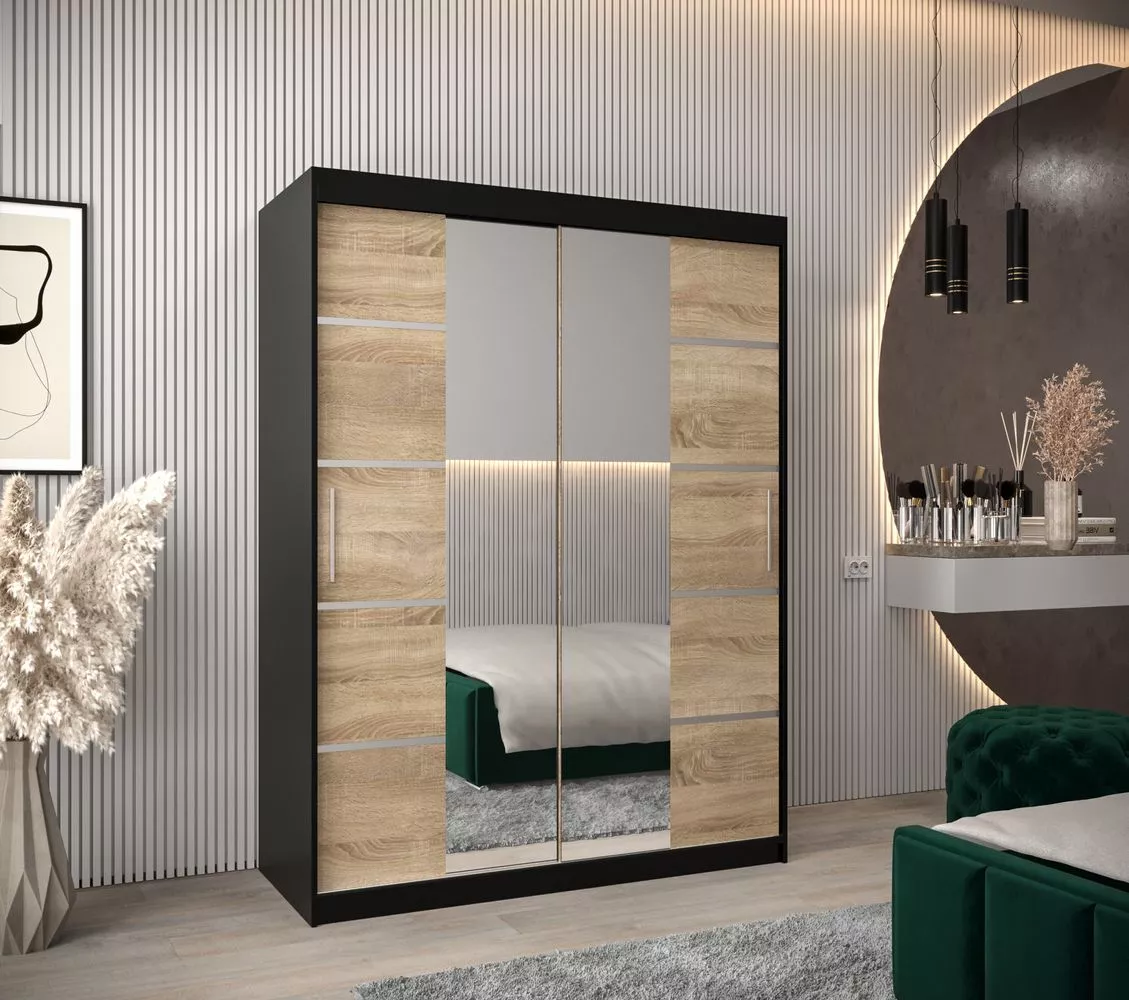 Skříň se zrcadly VIVIEN - šířka 150 cm, černá / dub sonoma