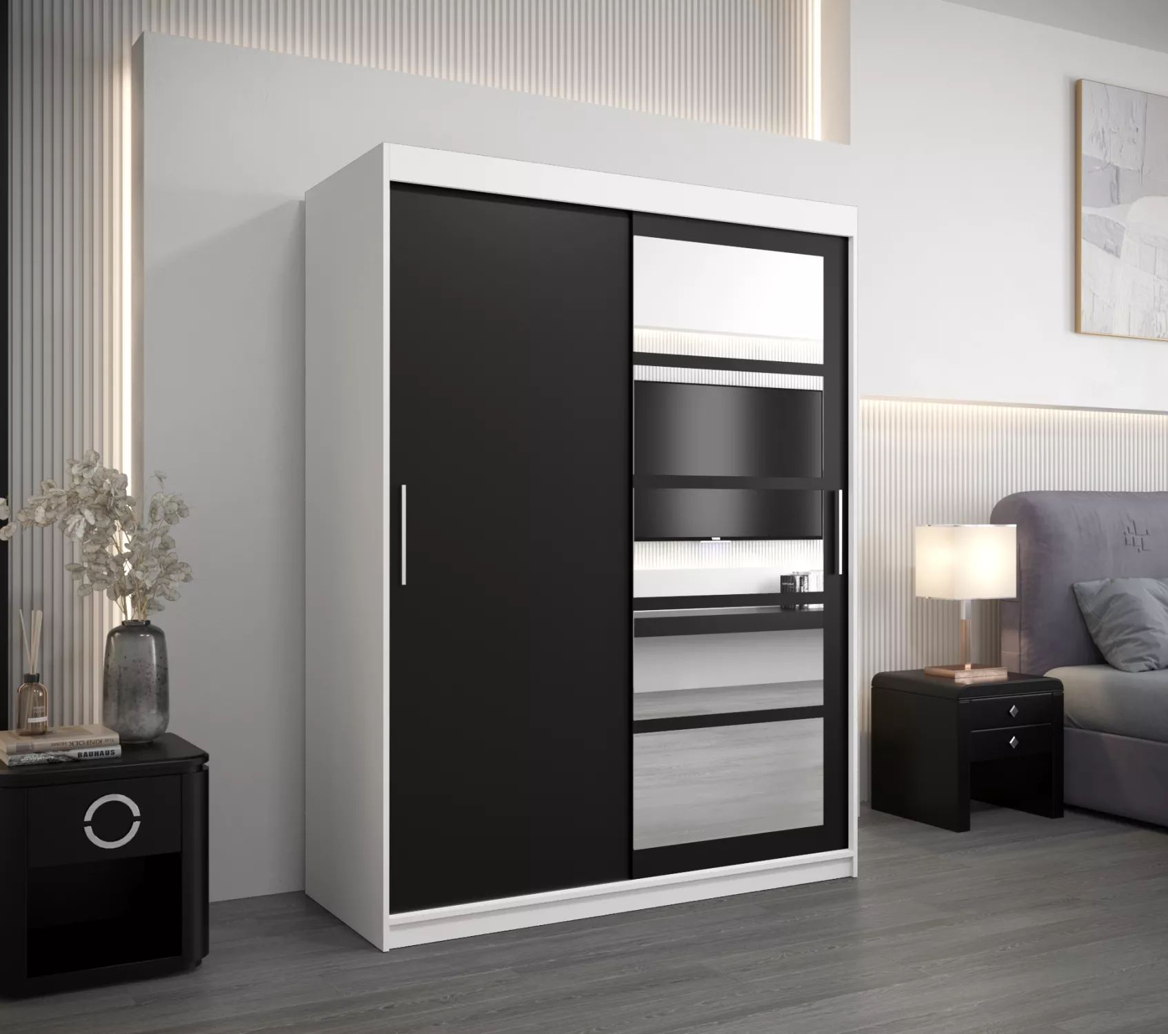 Šatní skříň se zrcadly KLEOPATRA - šířka 150 cm, bílá / černá