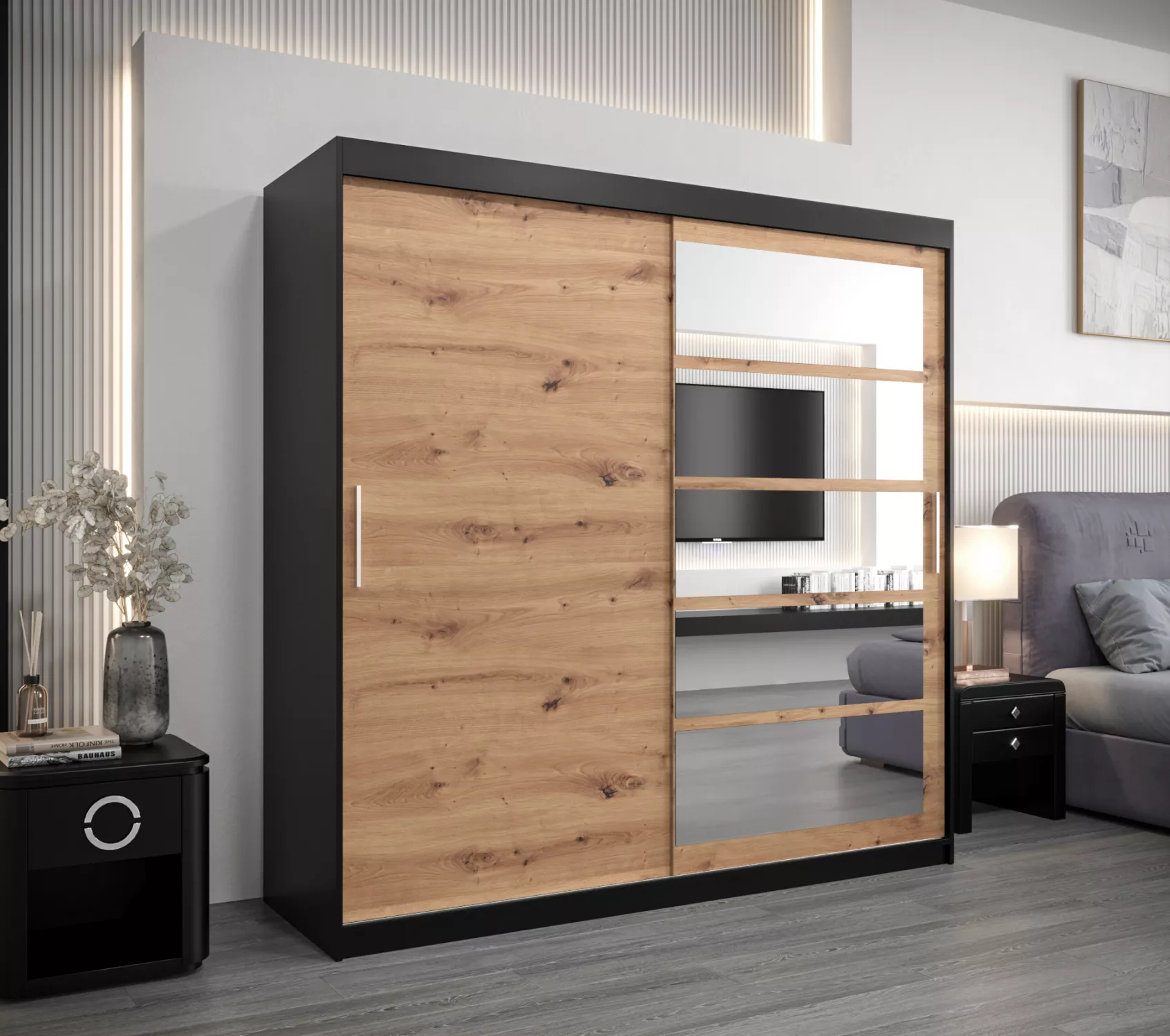 Šatní skříň DENISA - šířka 200 cm, černá / dub artisan