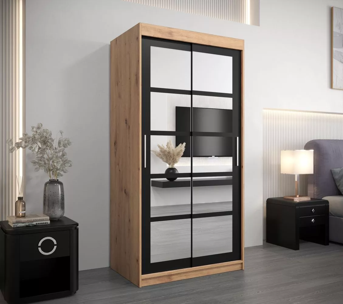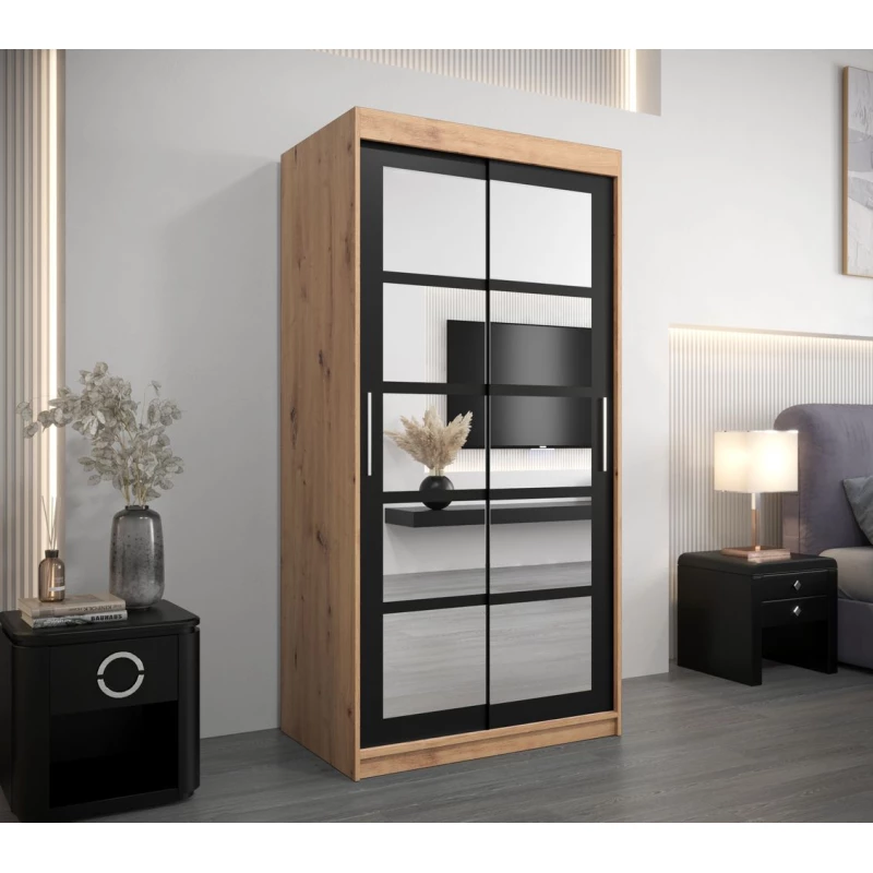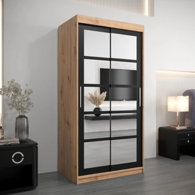 Šatní skříň se zrcadly ALENA - šířka 100 cm, dub artisan / černá