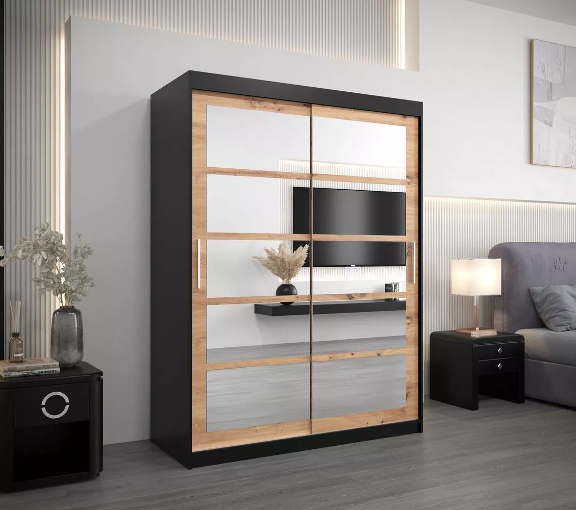 Šatní skříň se zrcadly KARLA - šířka 150 cm, černá / dub artisan