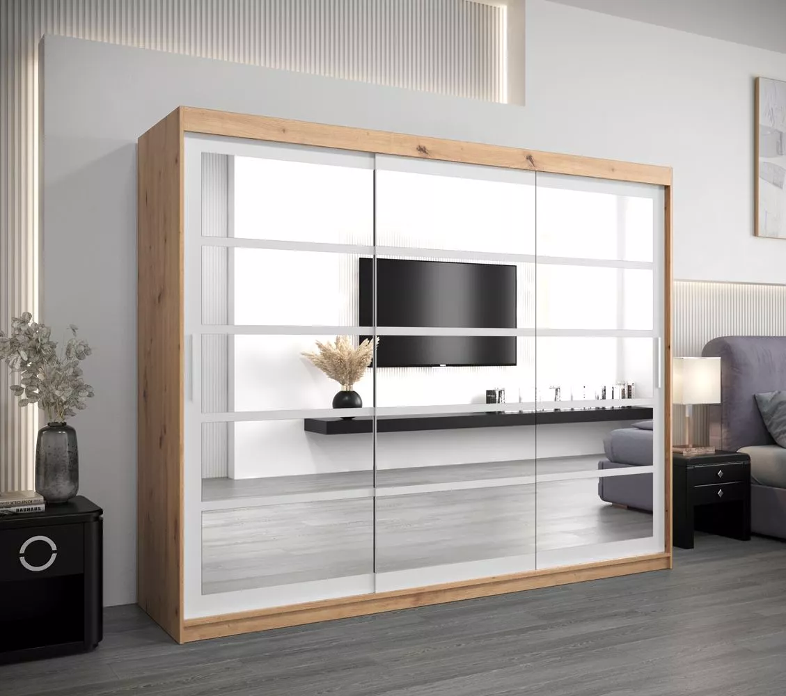 Skříň LEONA v moderním stylu se hodí do jakéhokoliv interiéru. Díky jednoduchému vzhledu bude vaše domácnost působit vzdušně a prosvětleně. Díky posuvným dveřím je skříň vhodná i pro menší místností. Skříň je vyrobena z LTD dřevěného materiálu, který je nenáročný na údržbu. Povrchová úprava je matná a přední část je doplněna praktickými zrcadly.