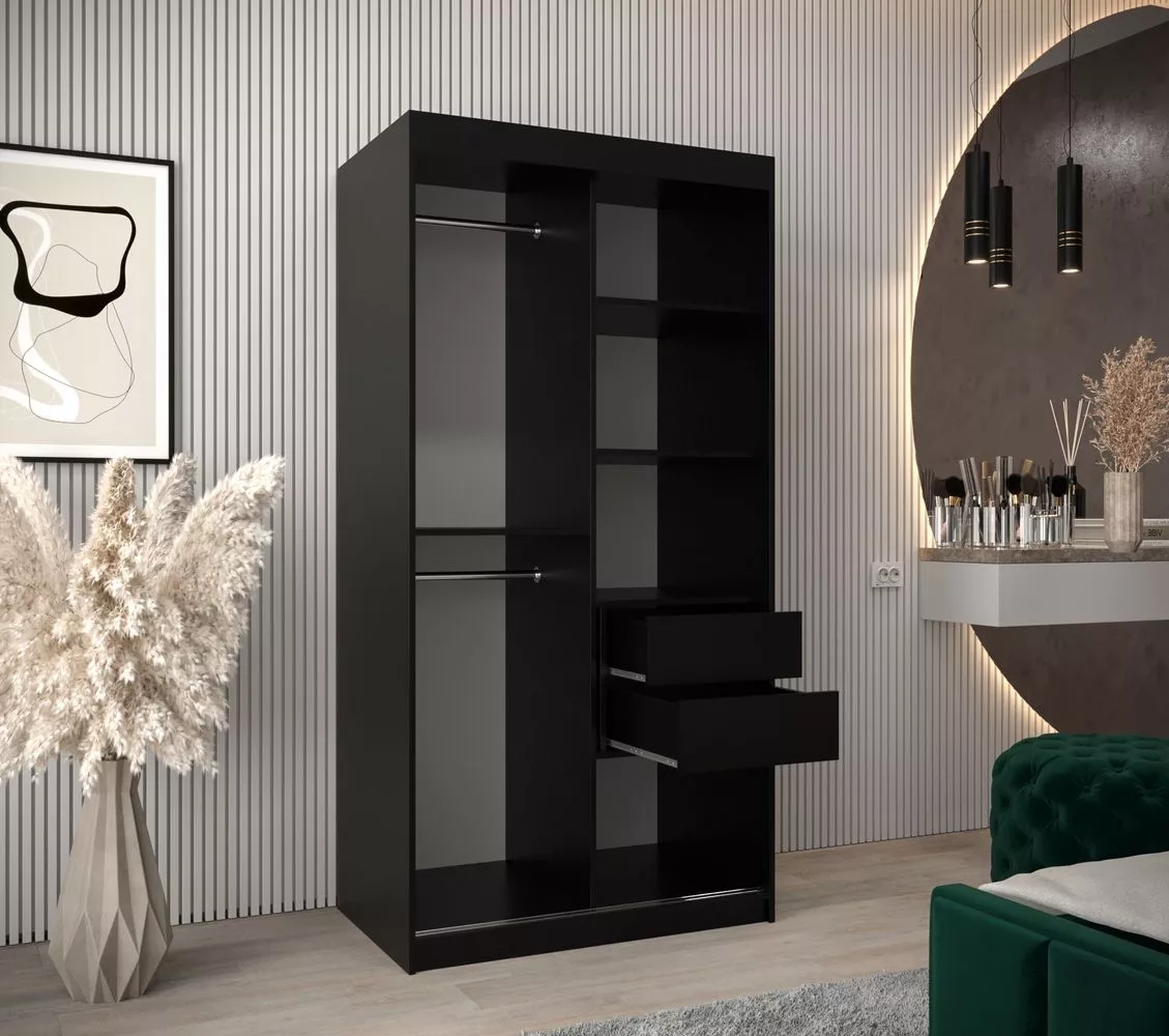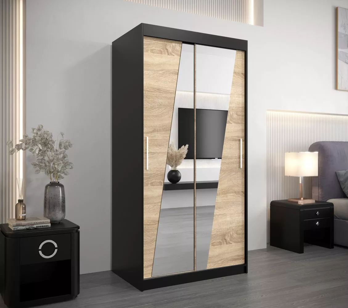 Šatní skříň se zrcadly ERIKA - šířka 100 cm, černá / dub sonoma