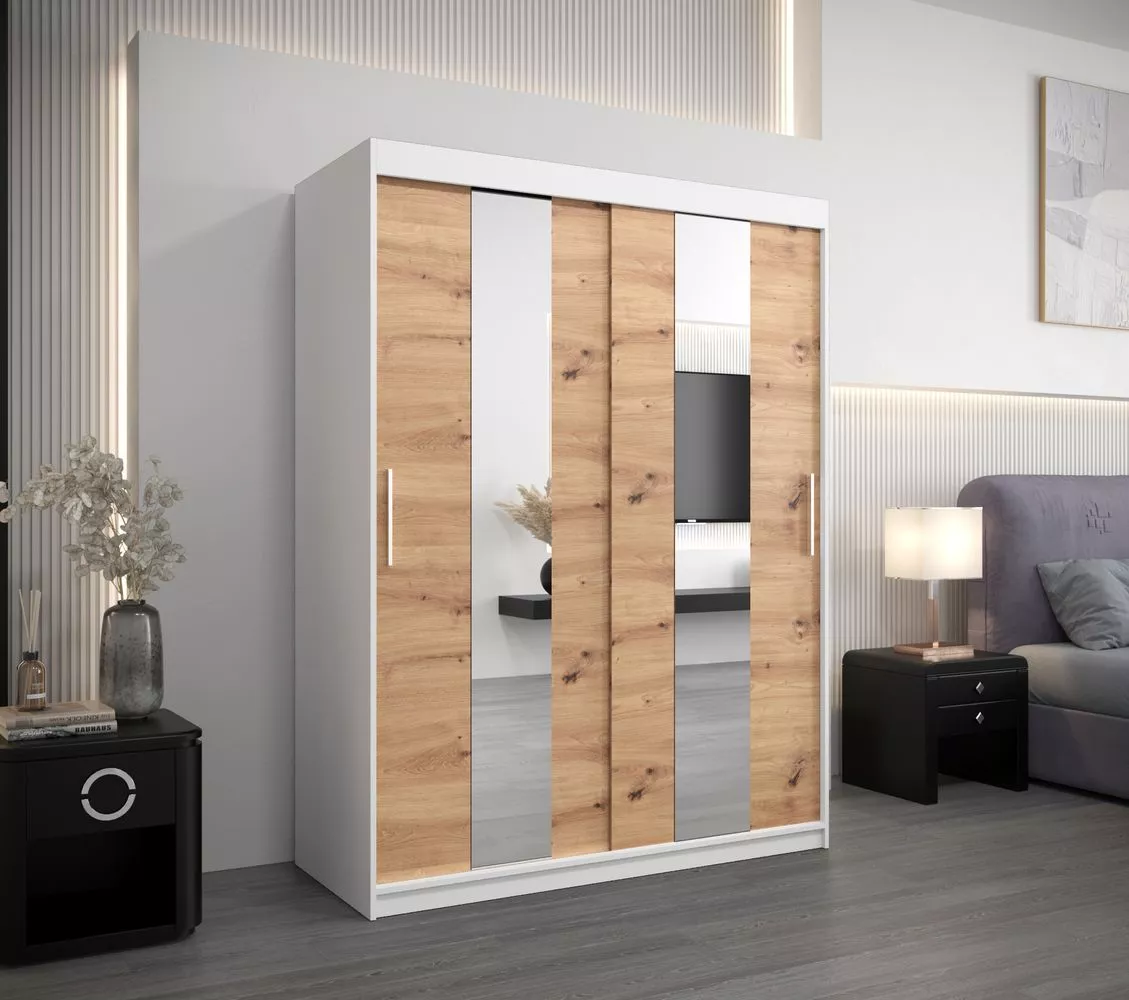 Šatní skříň se zrcadly MARGARET - šířka 150 cm, bílá / dub artisan