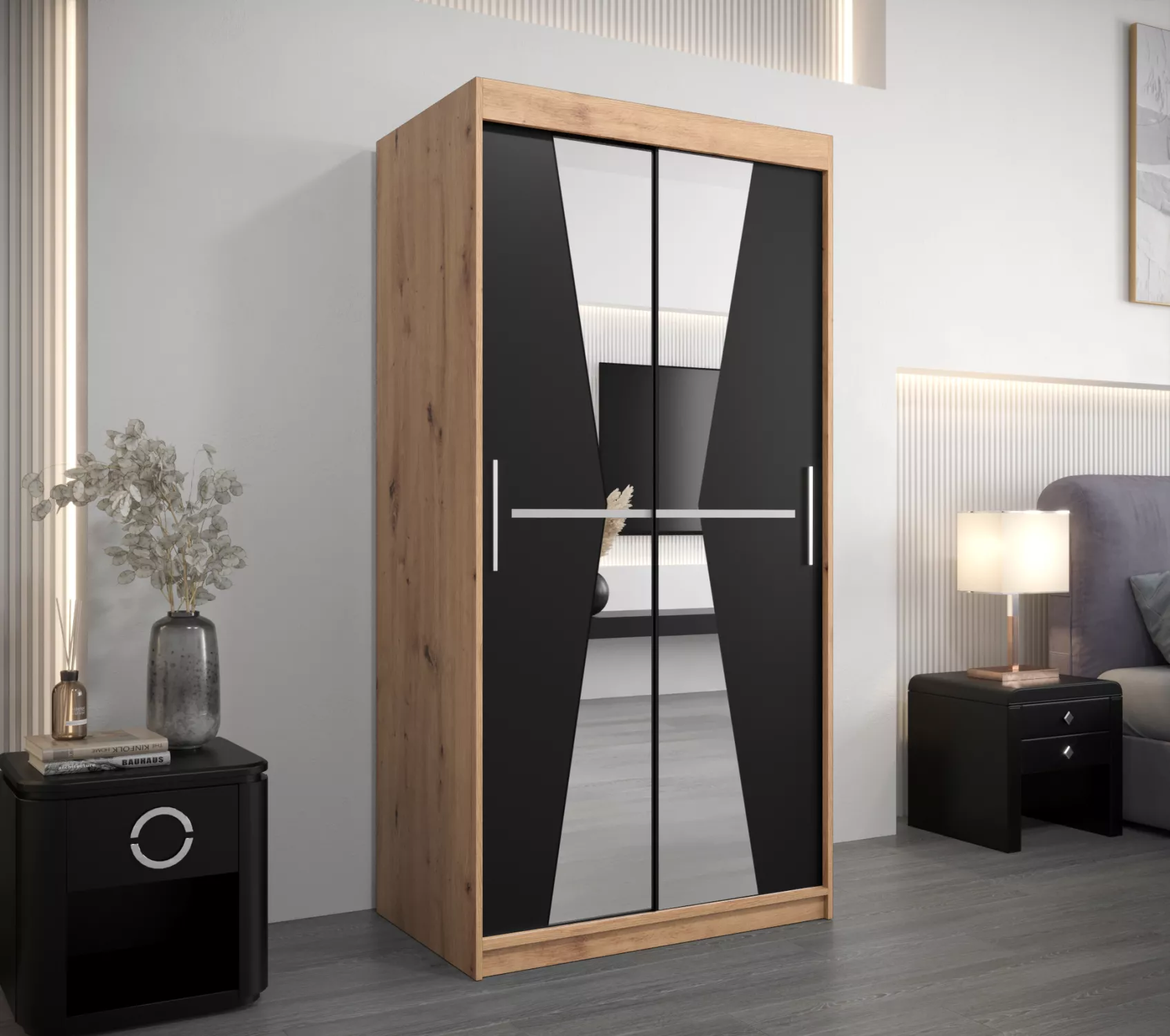 Šatní skříň se zrcadly MILANA - šířka 100 cm, dub artisan / černá