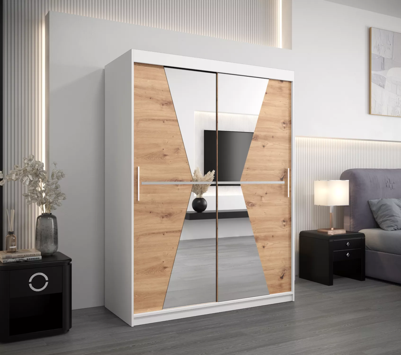 Šatní skříň se zrcadly MILANA - šířka 150 cm, bílá / dub artisan