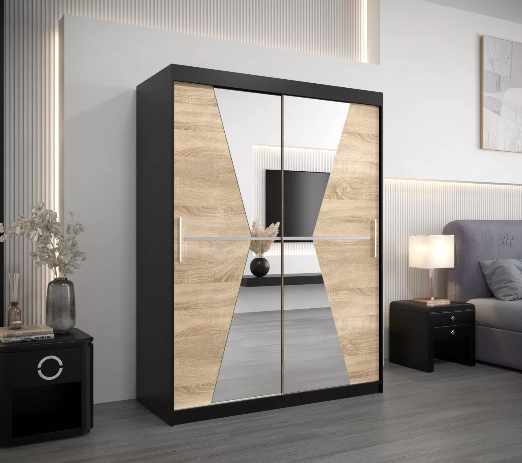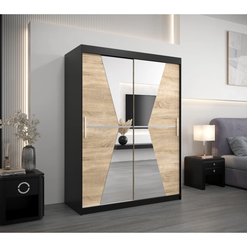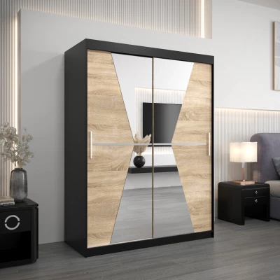 Šatní skříň se zrcadly MILANA - šířka 150 cm, černá / dub sonoma