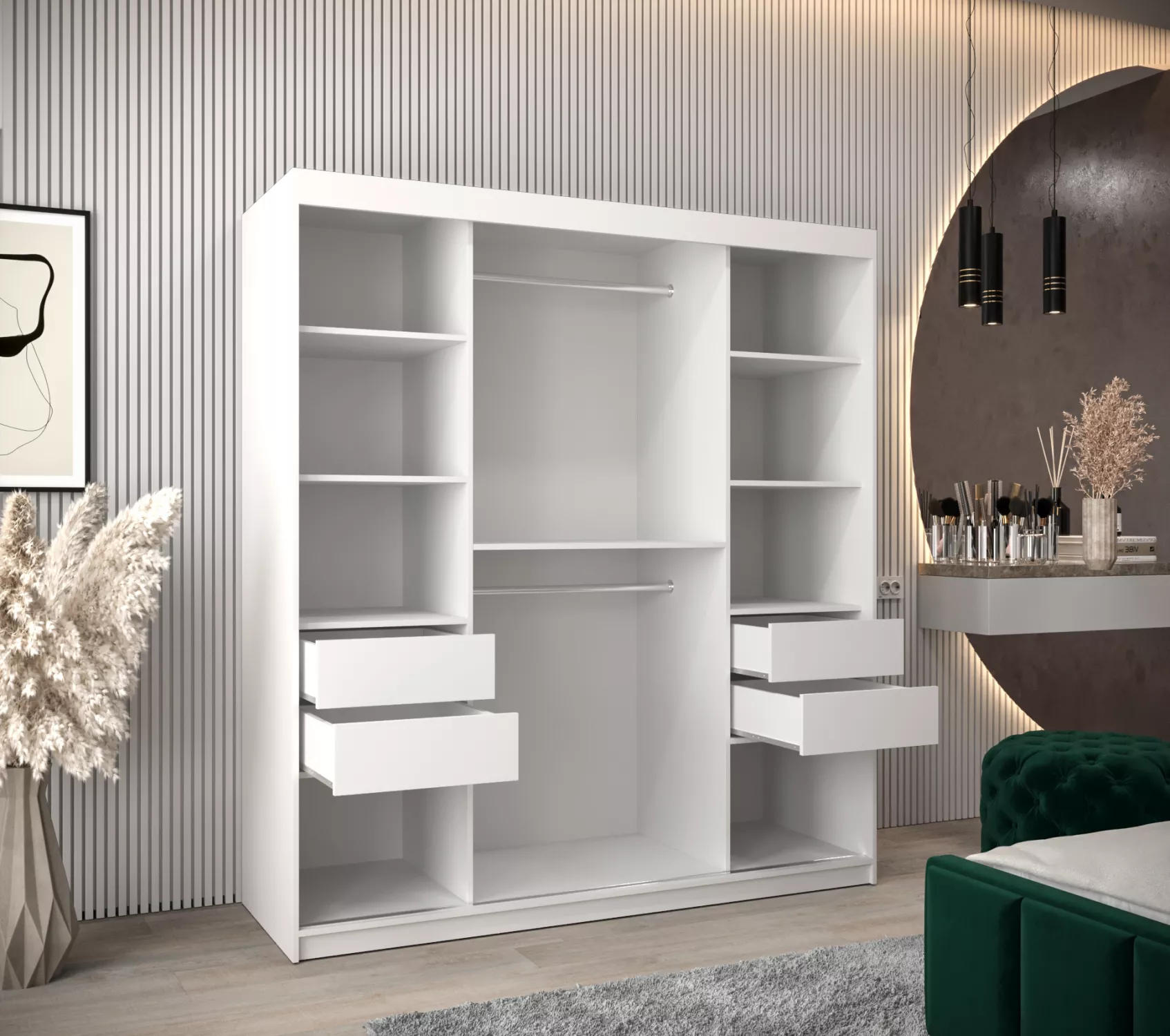Součástí skříně je 9 polic a 2 šatní tyče. Šuplíky vyobrazené na fotografii dokoupíte v sekci Doporučujeme přikoupit. Pořídíte je v setu po 2 kusech včetně vodících lišt (pojezdů). Do skříně je možné nainstalovat 2 sety šuplíků.