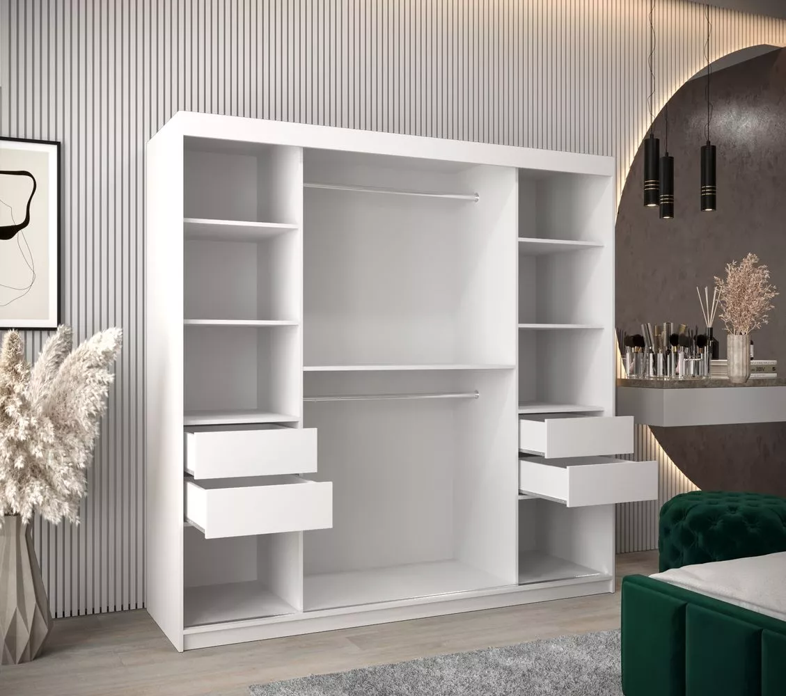 Součástí skříně je 9 polic a 2 šatní tyče. Šuplíky vyobrazené na fotografii dokoupíte v sekci Doporučujeme přikoupit. Pořídíte je v setu po 2 kusech včetně vodících lišt (pojezdů). Do skříně je možné nainstalovat 2 sety šuplíků.