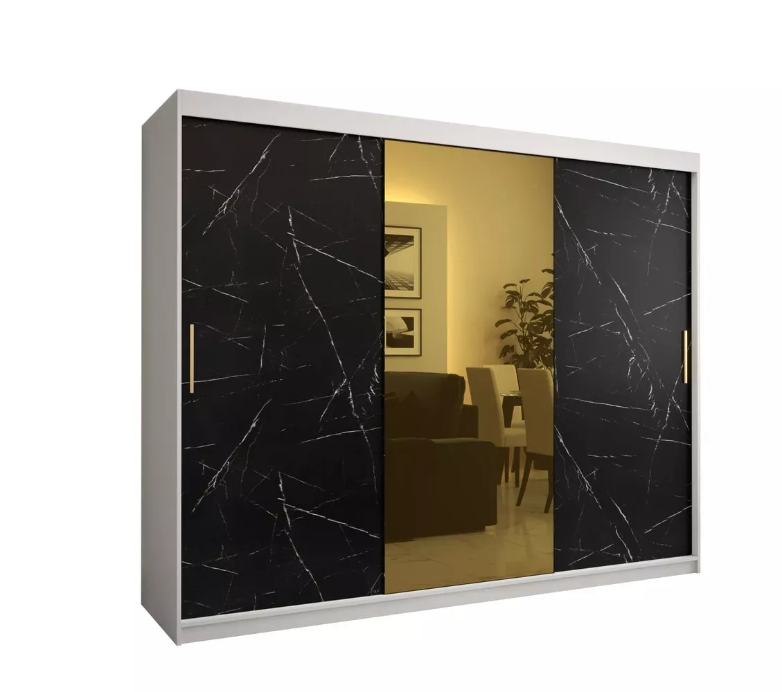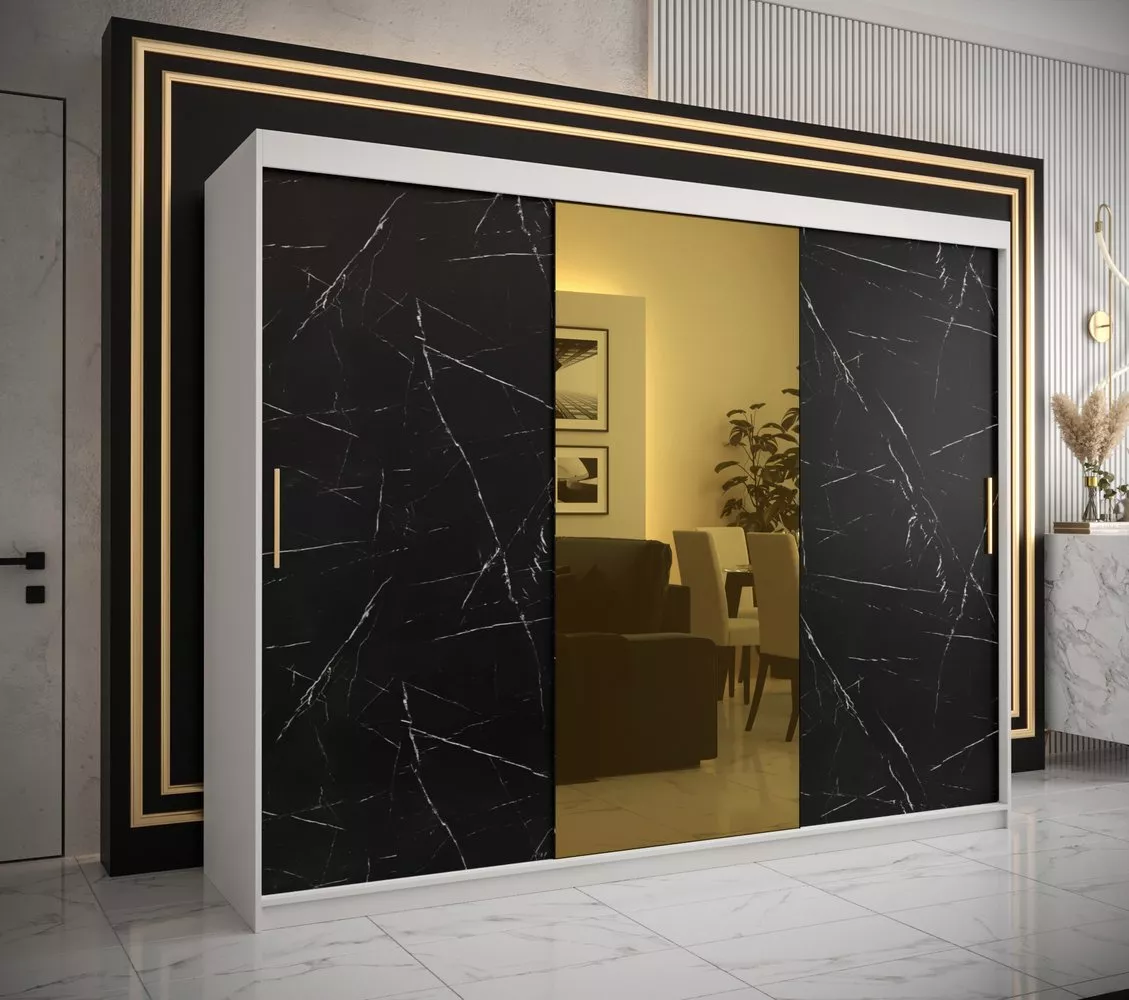 Designová šatní skříň se zlatým zrcadlem MADLA 1 - šířka 250 cm, bílá / černá