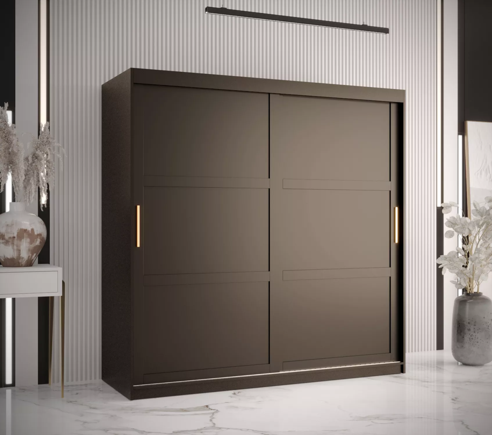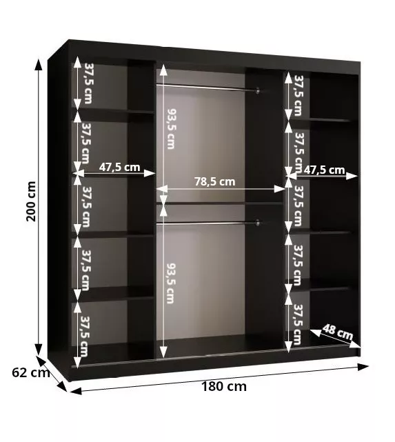 Šatní skříň s posuvnými dveřmi RAISA může být doplňkem každé ložnice nebo předsíně. Vnitřní uspořádání je tvořeno hlubokými policemi a šatní tyčí, které umožňují snadné oddělení každodenních věcí.
