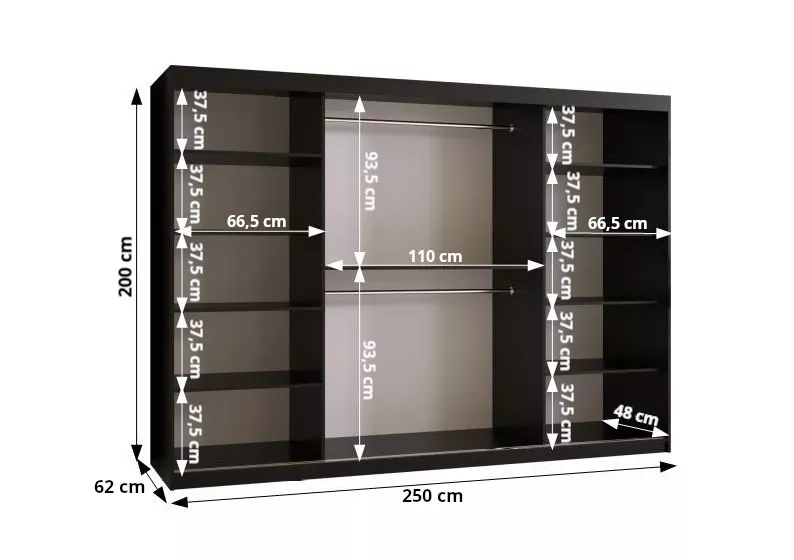 Šatní skříň s posuvnými dveřmi RAISA může být doplňkem každé ložnice nebo předsíně. Vnitřní uspořádání je tvořeno hlubokými policemi a šatní tyčí, které umožňují snadné oddělení každodenních věcí.