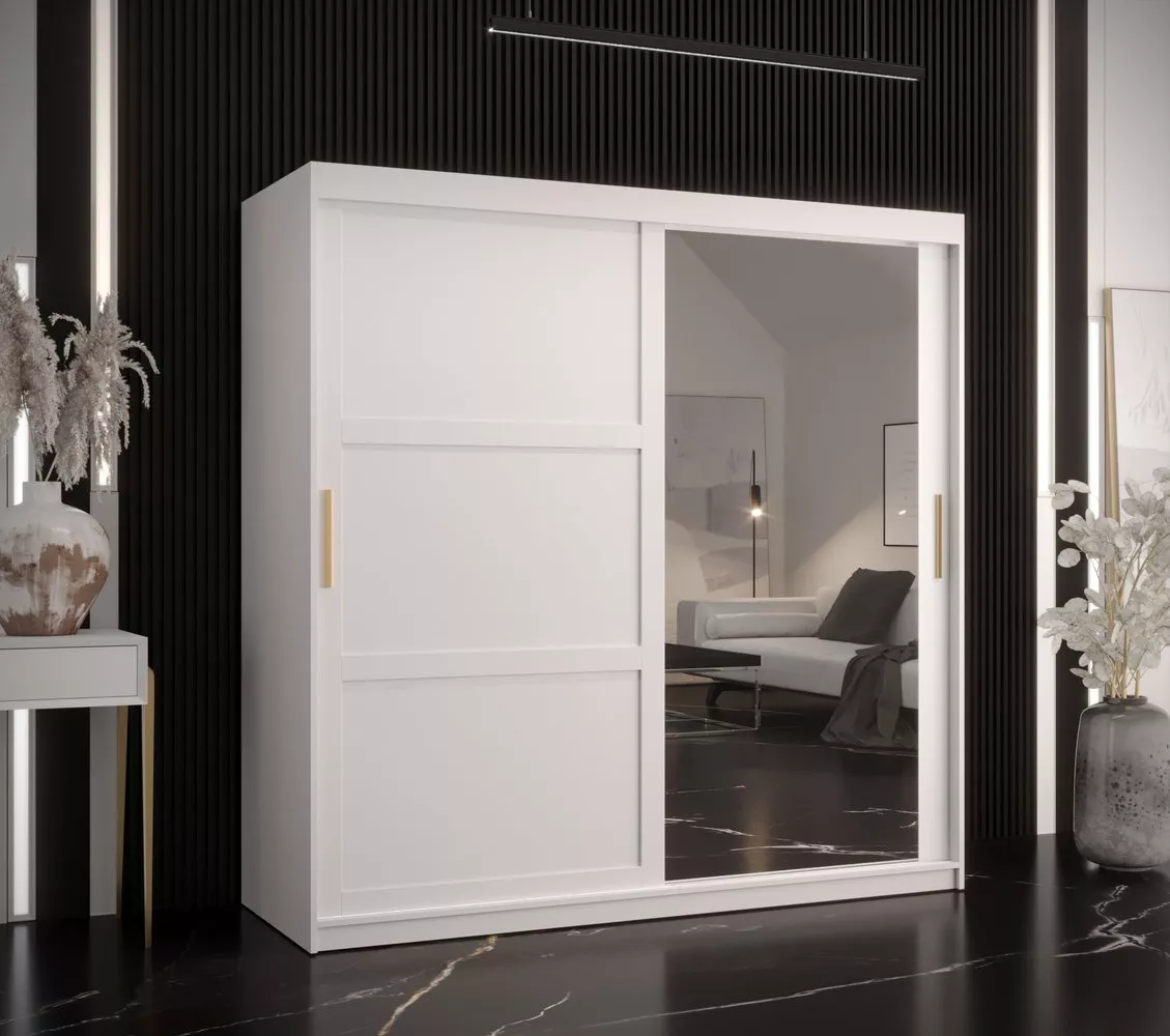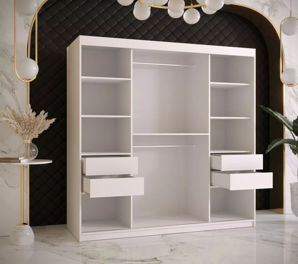 Šatní skříň s posuvnými dveřmi RAISA může být doplňkem každé ložnice nebo předsíně. Vnitřní uspořádání je tvořeno hlubokými policemi a šatní tyčí, které umožňují snadné oddělení každodenních věcí.