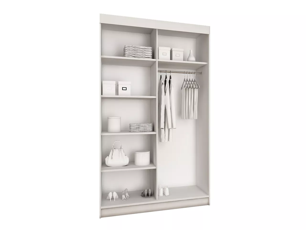 Šatní skříň ELVIRA 2 o šířce 100 cm nabízí dostatek úložného prostoru. Vnitřek skříně tvoří šatní tyč a řada hlubokých polic. Skříň je navíc doplněna o praktické zrcadlo a inovativní RGB LED osvětlení.