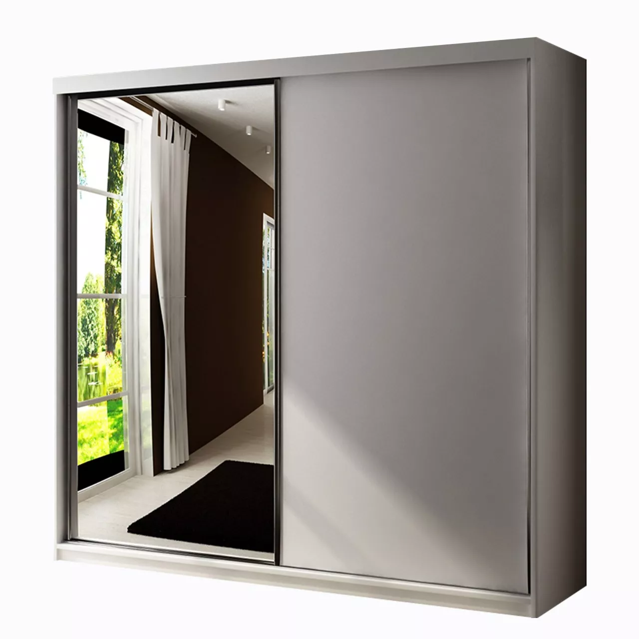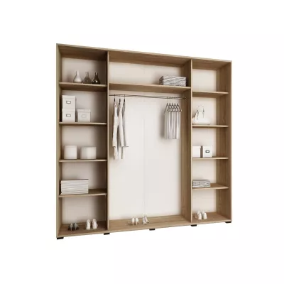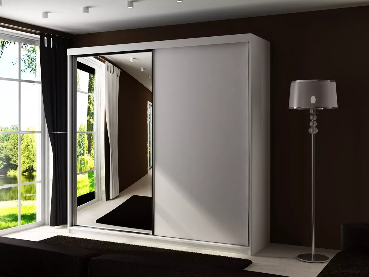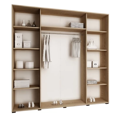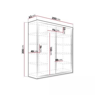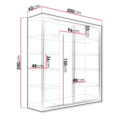 Šatní skříň ELVIRA 5 o šířce 200 cm nabízí dostatek úložného prostoru. Ve střední části skříně s posuvnými dveřmi se nachází tyč pro zavěšení oblečení. Úložné zóny umístěné po stranách jsou zase vybaveny hlubokými policemi. Skříň je navíc doplněna o praktické zrcadlo a inovativní modrým LED osvětlení.