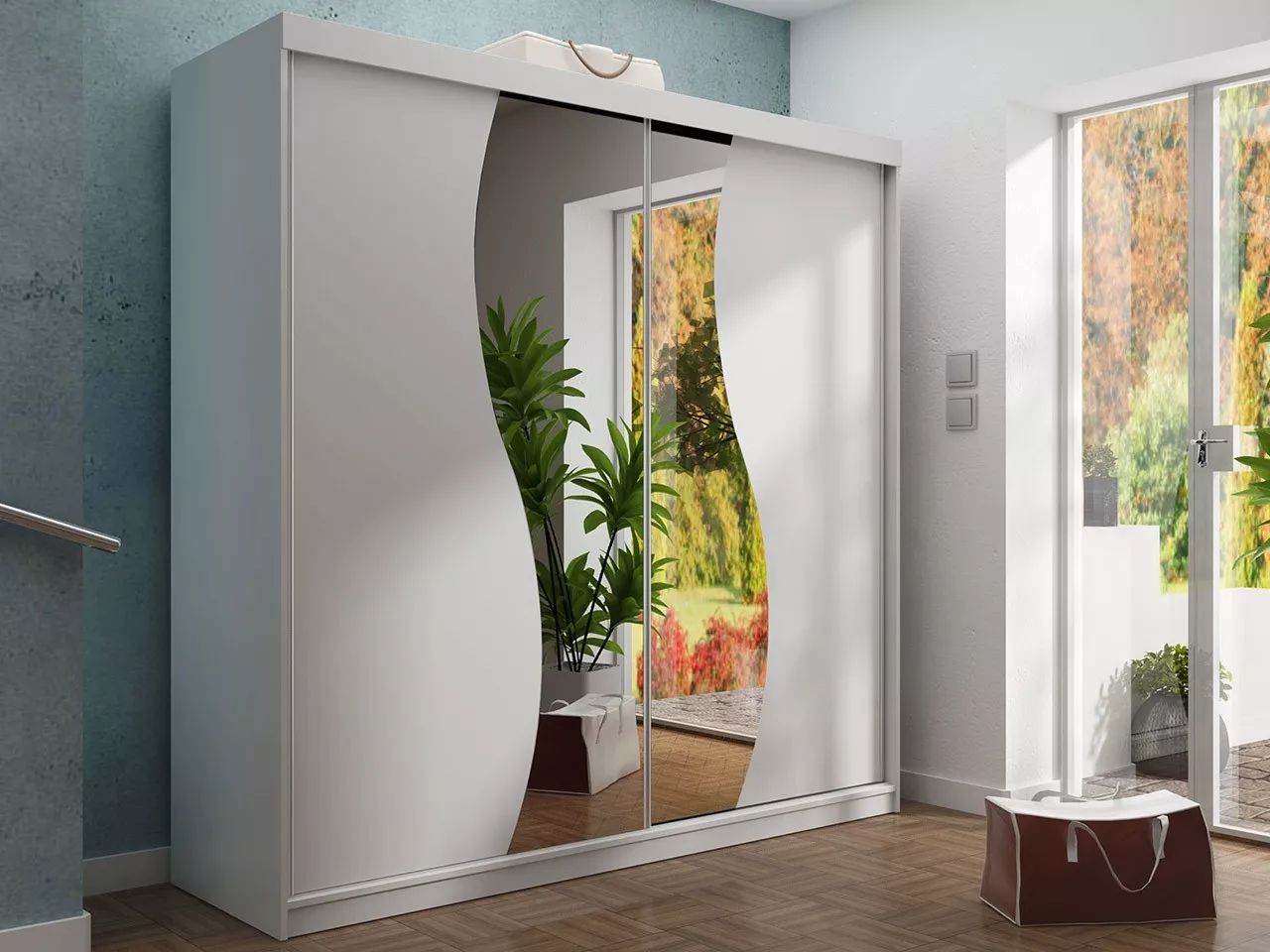 Zrcadlová šatní skříň 200 cm s modrým LED osvětlením ELVIRA 7 - bílá