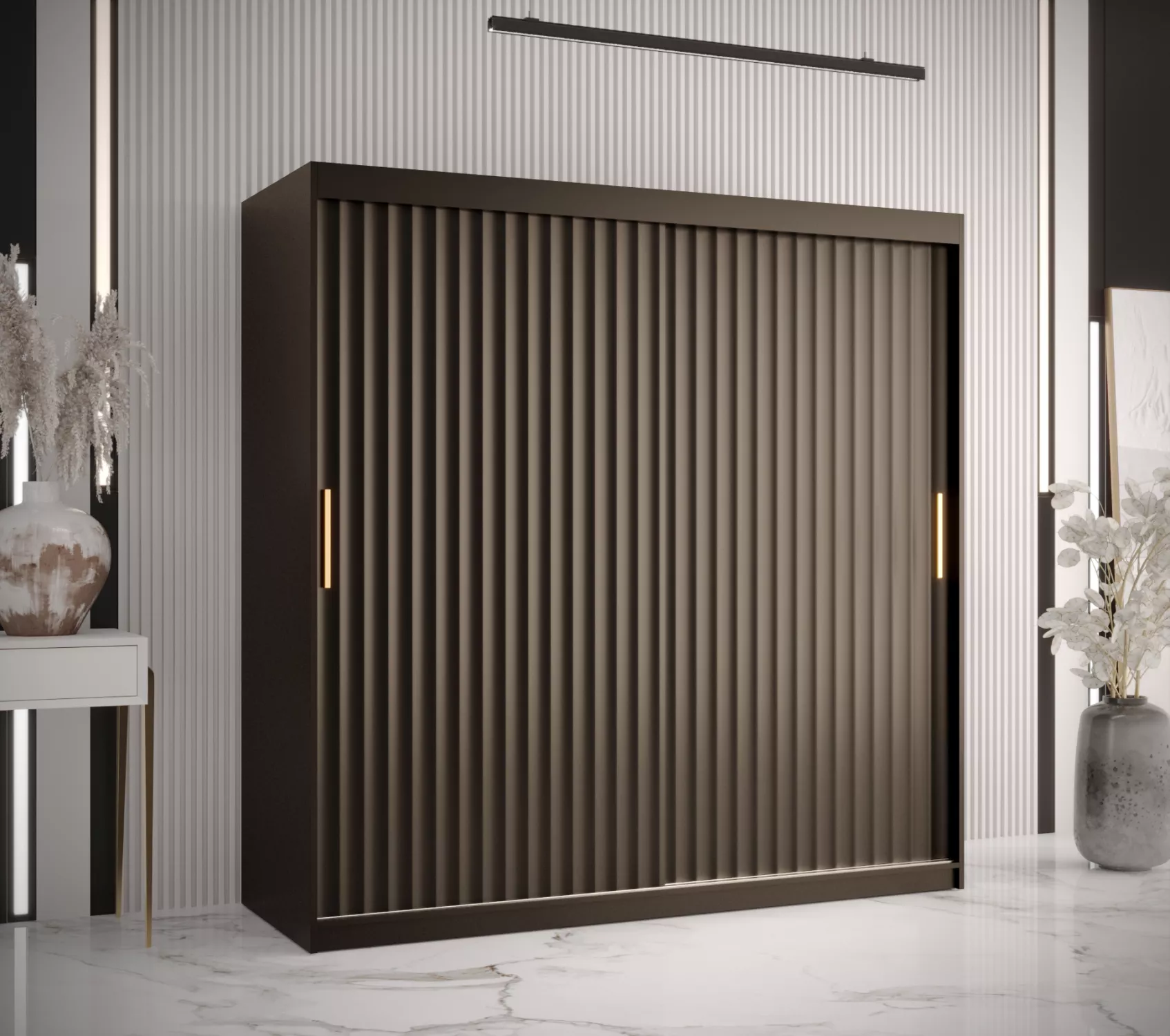 Šatní skříň RADKIN 1 zaujme stylovými dvířky s drážkami. Disponuje 9 policemi a 2 šatními tyčemi.