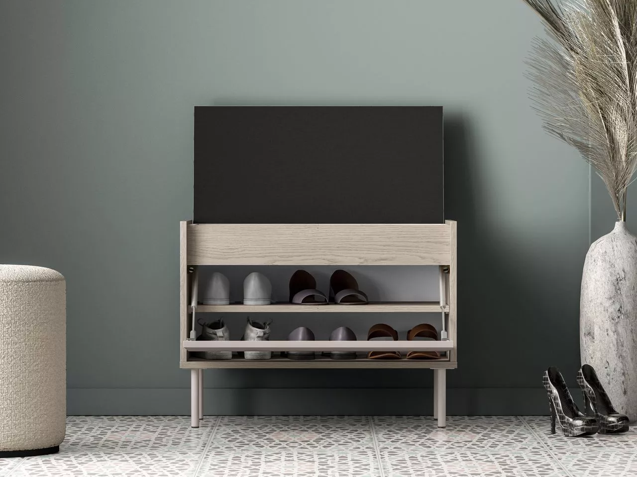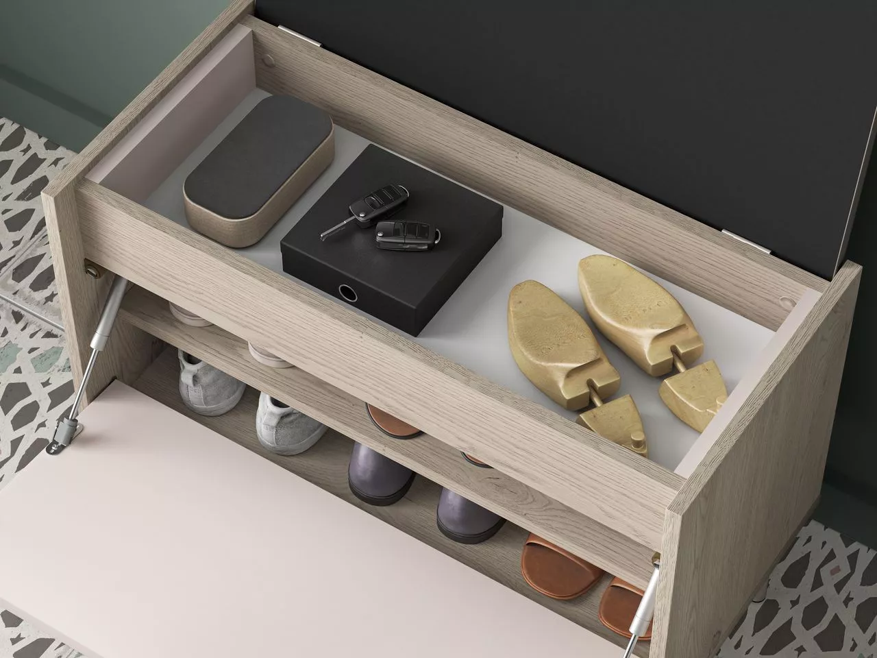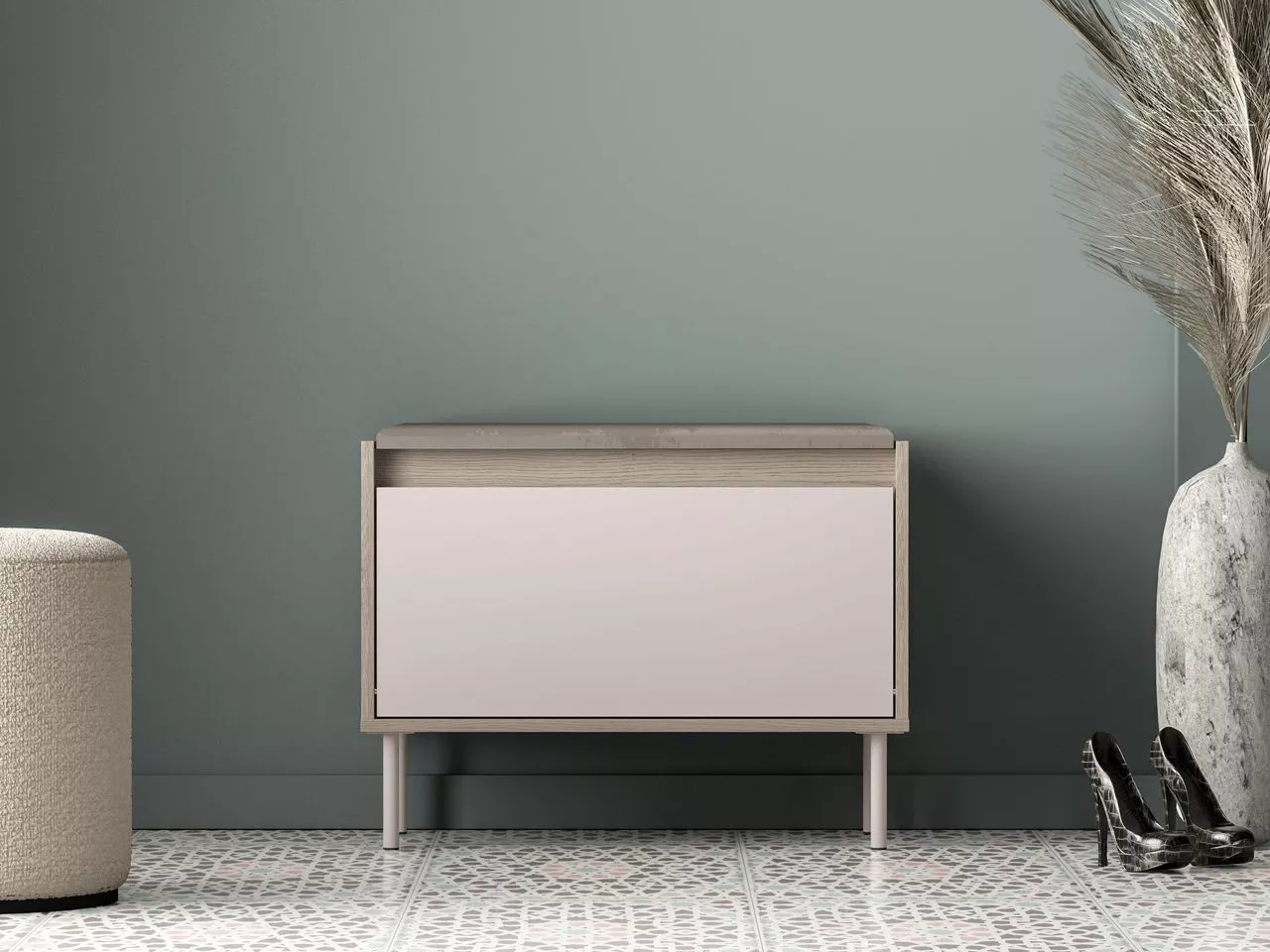 Výklopný botník se sedákem RENATE se stane nezbytným vybavením každé předsíně nebo chodby. Disponuje výklopnými dvířky, za kterými jsou 2 přihrádky pro uschování bot. Pod výklopným sedákem se schovává další úložný prostor pro uložení potřebných dokumentů nebo klíčů.
