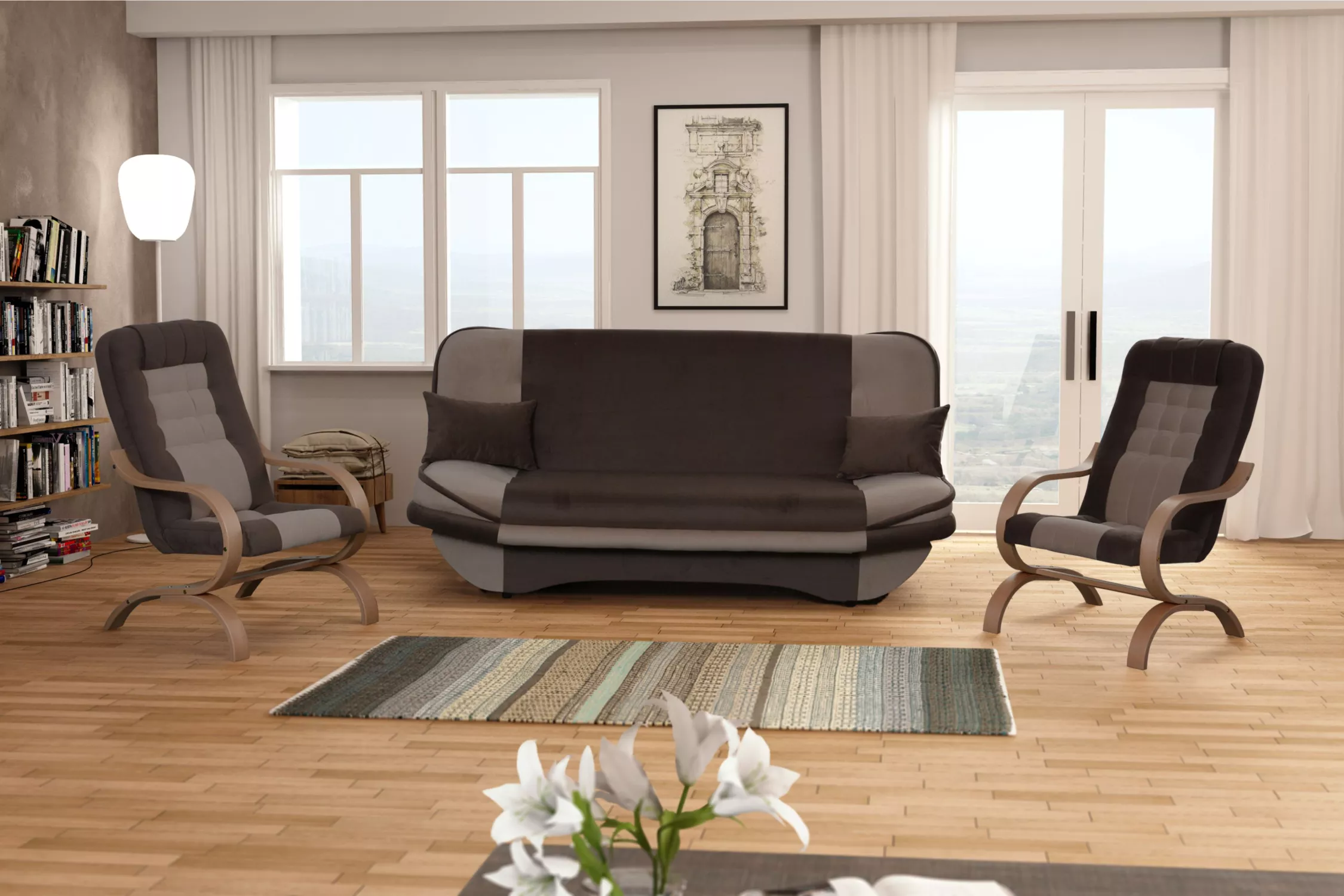 Sedací sestava INGRIDA se skládá z pohovky a 2 křesel. Pohovka disponuje rozkládací funkcí na lůžko o rozměrech 122x200 cm. Křesla zaujmou svými designovými područkami a nožkami.