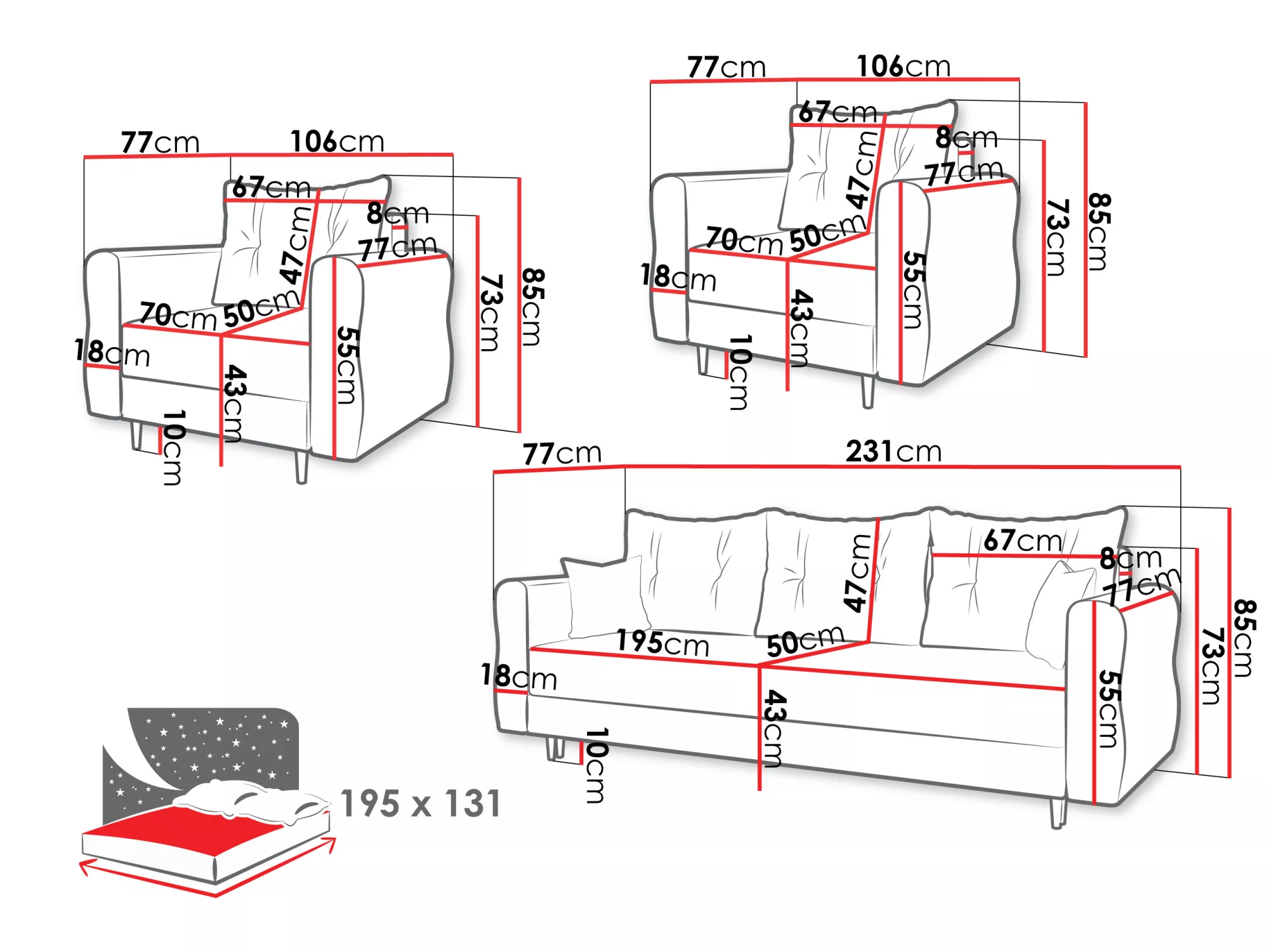 - trojmístná rozkládací pohovka: 231/85/77 cm