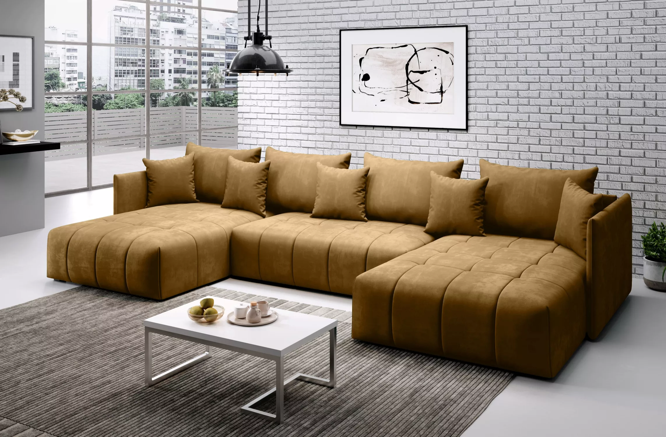 Sedací souprava do U VALENTINI svým designem zapadne do všech moderních obývacích pokojů. Opěradlo ve formě volně ložených polštářů vám zpříjemní každodenní používání. Zadní část sedačky je čalouněná látkou, což umožňuje její umístění kdekoliv v místnosti.