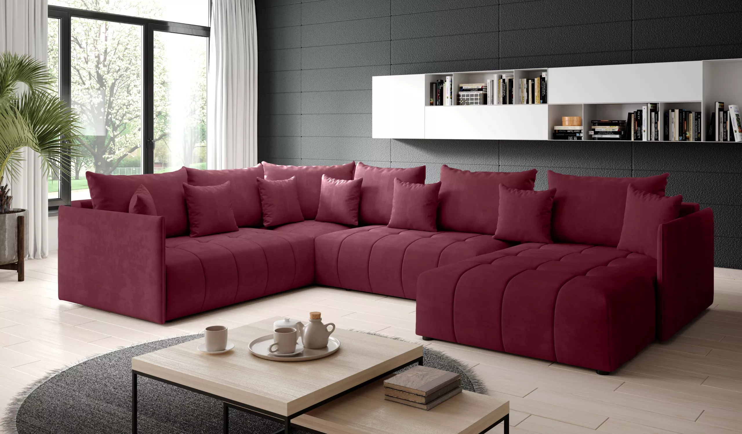 Velká sedací souprava do U VALENTINI BIS svým designem zapadne do všech moderních obývacích pokojů. Opěradlo ve formě volně ložených polštářů vám zpříjemní každodenní používání. Zadní část sedačky je čalouněná látkou, což umožňuje její umístění kdekoliv v místnosti.