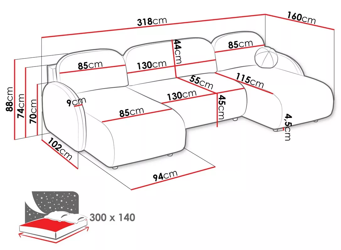 Rozkládací sedačka do tvaru U LACROSSE spojuje elegantní design se špičkovou funkčností. Zaoblené linie dodávají sedačce lehkost a jemný charakter. Úložný prostor uschová přikrývky i polštáře, zatímco volně ložené opěrné polštáře zvyšují pohodlí při sezení. Díky rozkládací funkci jednoduše vytvoříte prostorné lůžko o rozměrech 140x300 cm, ideální pro lenošení i každodenní spaní.