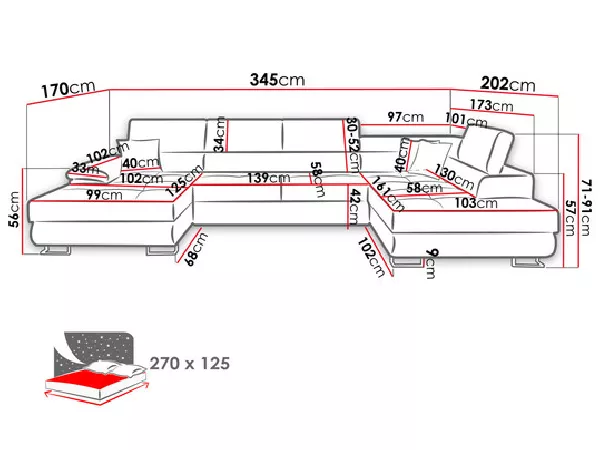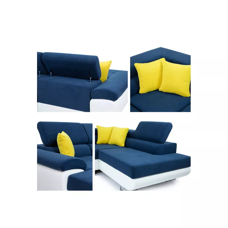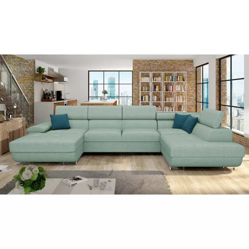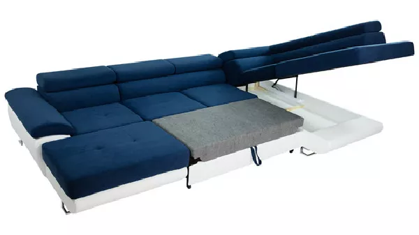 Sedací rozkládací souprava do U SAN DIEGO určitě osloví fanoušky mimořádné elegance ve skutečně hollywoodském vydání. Poutavá forma osvěží design interiéru a zajistí konzistentní styl v celém obýváku. Rohová sedačka typu "U" zaručuje pocit pohodlí a relaxace. Základem rohové konstrukce je dřevěný rám, který byl pokryt speciální pružinou a silnou vrstvou pružné pěny. Kombinace těchto vysoce kvalitních komponentů dává sedadlu úžasnou měkkost. Zvýšené pohodlí při sezení zahrnuje nastavitelné opěrky hlavy. K dispozici máte několik stupňů sklonu, díky kterým si můžete přizpůsobit polohu každé z opěrek hlavy a dokonale ji přizpůsobit svým osobním potřebám a preferencím. Jednoduchým vytažením střední části sedadla získáte spací plochu o rozměrech 125 x 270 cm. V sedací soupravě naleznete praktický úložný prostor na ložní prádlo, který lze například také využít jako místo pro úschovu sezónního oblečení.