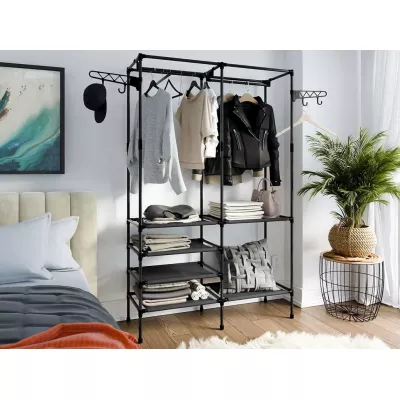 Kovový stojan na šaty GILMER je moderním a funkčním úložným řešením do vaší domácnosti. Rám je vyroben z odolného kovu, který zajišťuje stabilitu konstrukce. Police vyrobené z polyesterové netkané textilie, jsou odolné a snadno se čistí. Stojan je také vybaven speciálními háčky.