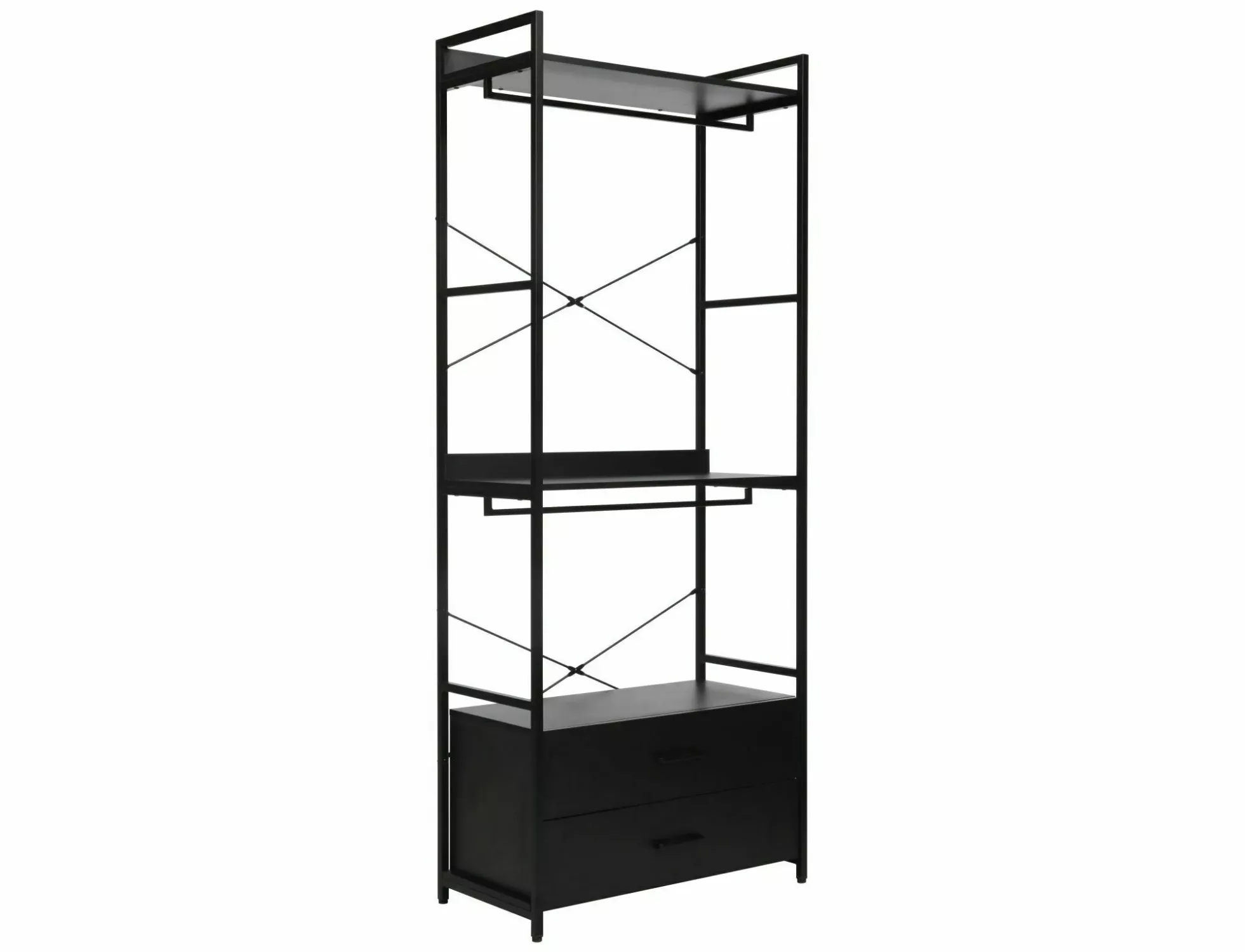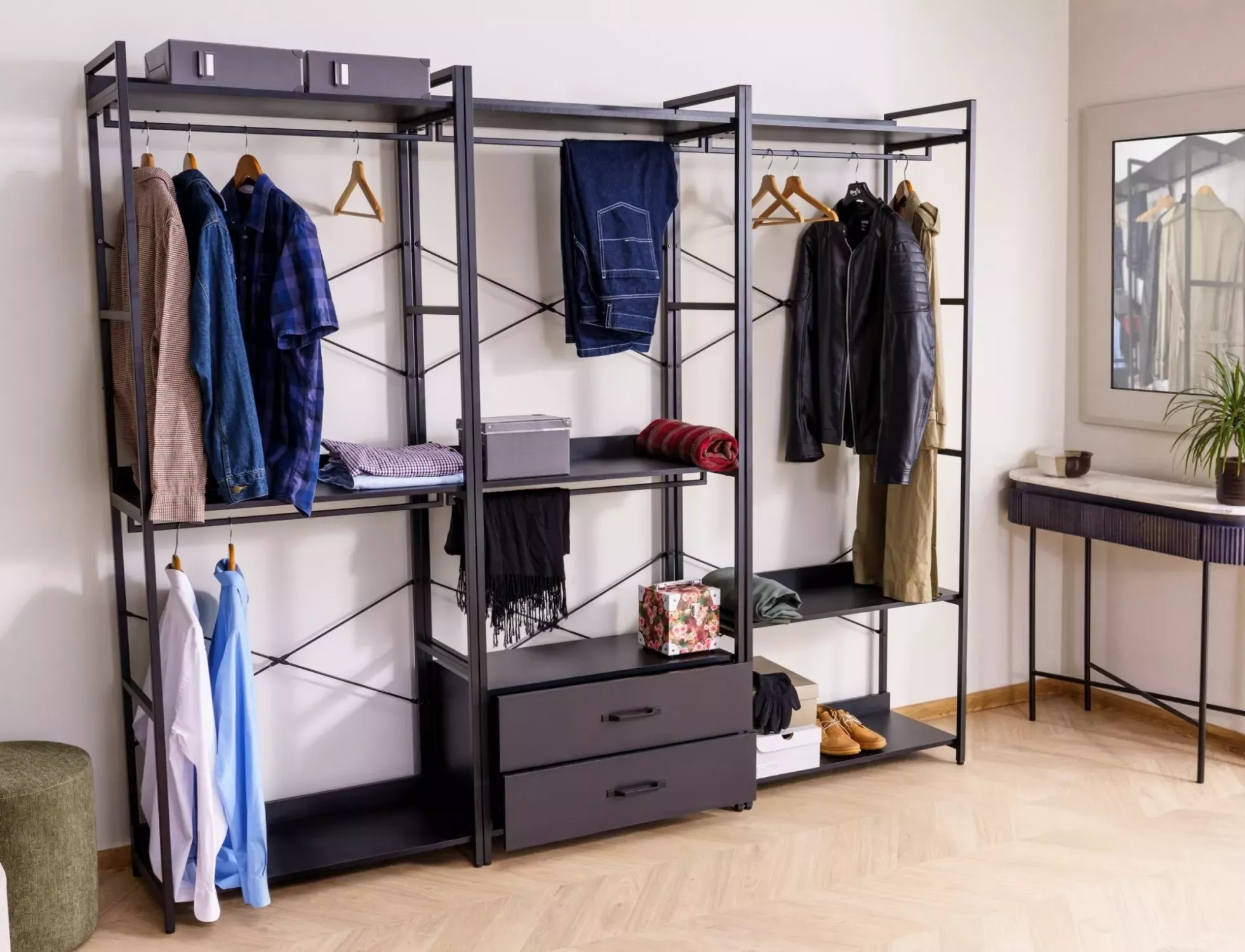 Kovový stojan na šaty SANELA 3 je stylovým kusem nábytku, který se hodí do moderních interiérů a nabízí univerzální řešení. Konstrukci doplňují dvě police, šatní tyče a prostorné šuplíky.