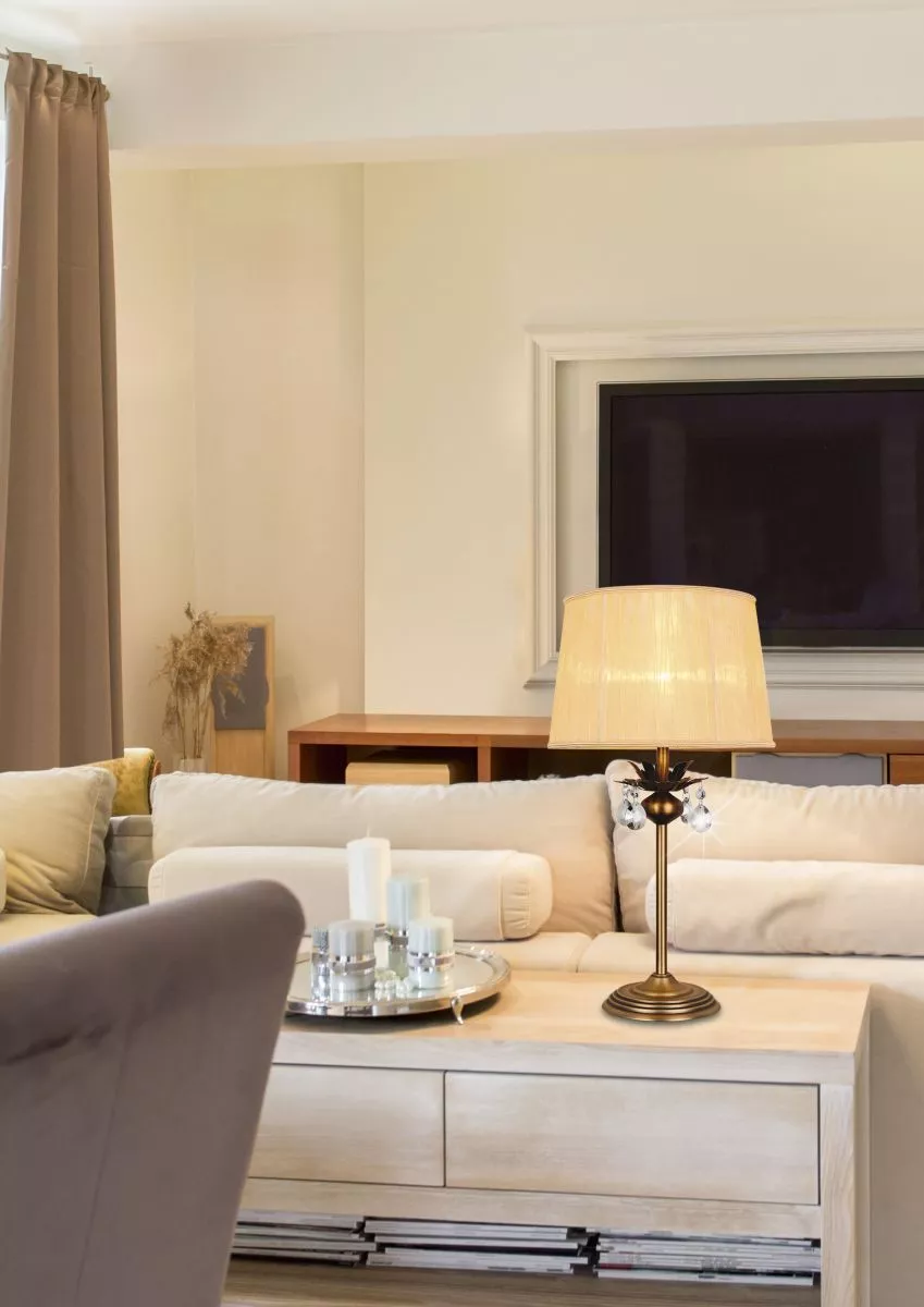 Stolní lampa v klasickém stylu ADONIS se postará o příjemné osvětlení při čtení i klidném odpočinku v ložnici či obývacím pokoji! Patinovaná konstrukce s plastovými krystalky doplněná textilním stínidlem s elegantním lemem působí klasicky a ve světle vytváří jemný třpyt. Určeno pro žárovku s paticí E27 a maximálním výkonem 60 W. Pro úsporu el. energie doporučujeme osadit úspornou LED žárovkou. Krytí IP20 značí vhodnost použití v interiéru.