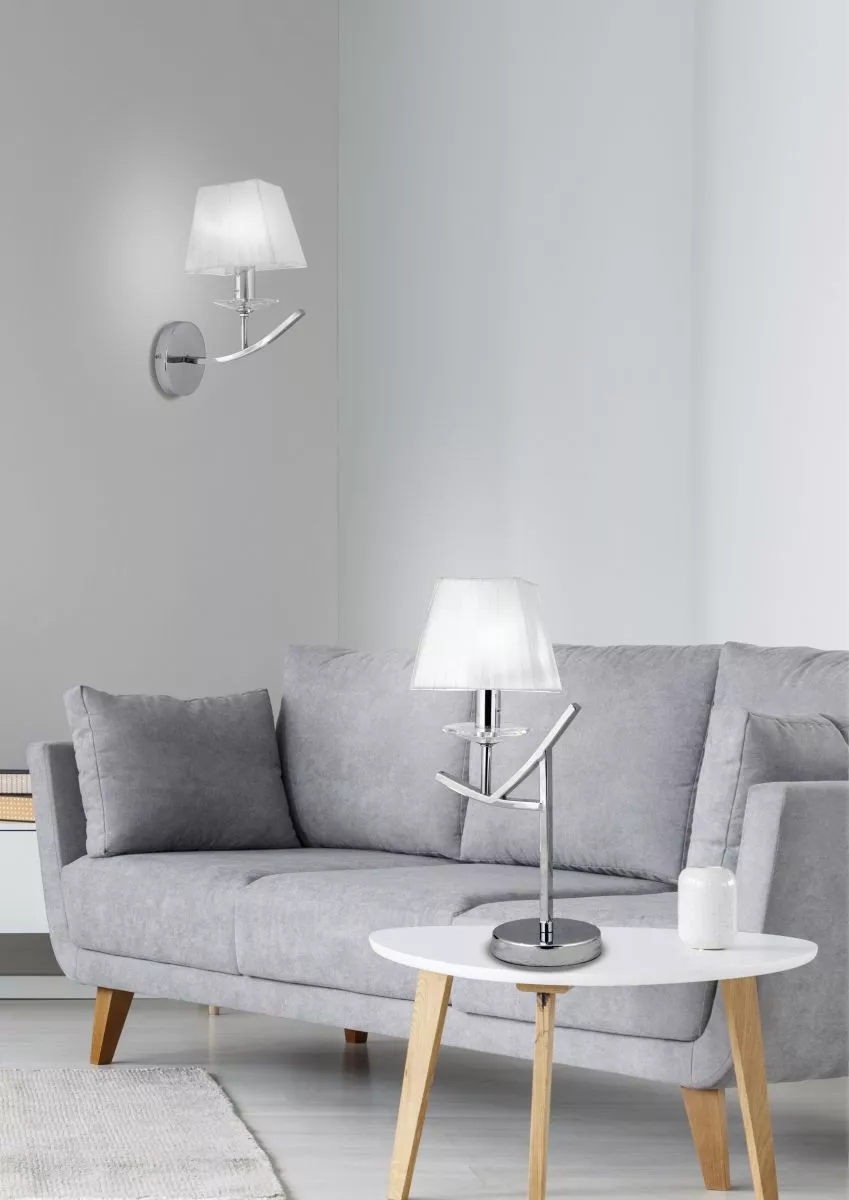 Vneste do svého interiéru důstojný a sofistikovaný akcent se stolní lampičkou VALENCIA, která zaujme exkluzivní kombinací kovu, skla a textilie! Ploché rameno v chromovaném provedení doplněné skleněnou dekorací vytváří precizní a elegantní vzhled. Skvěle zapadne do hotelových apartmánů, reprezentativních obývacích pokojů i klasicky zařízených interiérů. Určeno pro žárovku s paticí E14 a maximálním výkonem 40 W. Pro úsporu elektrické energie doporučujeme osadit úspornou LED žárovkou. Krytí IP20 značí vhodnost použití v interiéru.