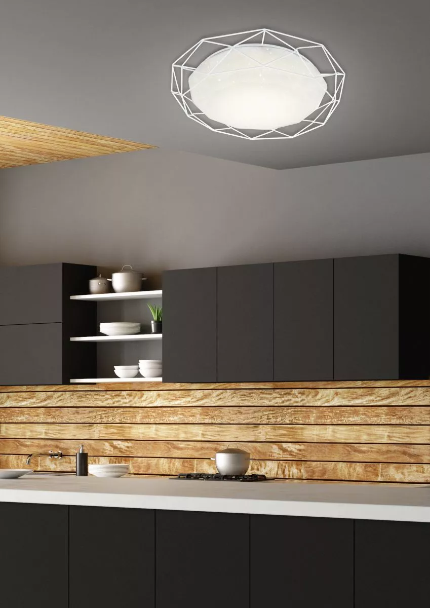 Stropní přisazené LED svítidlo SVEN vnese do vašeho interiéru jedinečnou atmosféru. Svítidlo má bílé plastové stínidlo s neobvyklou prostorovou strukturou a po rozsvícení vytváří efekt hvězdné oblohy. Navíc je po obvodu lemováno elegantním kovovým prstencem v bílé barvě. Svítidlo je vybaveno LED modulem o výkonu 16 W, který vyzařuje teplé bílé světlo 3000 K. Krytí IP20 značí vhodnost použití v interiéru.