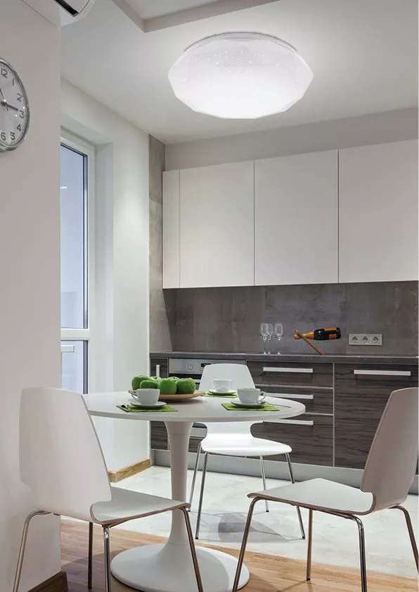LED stropní světlo s efektem noční oblohy SKY EFECT je moderní, přisazené stropní svítidlo o průměru 51 cm. Svítidlo má kovovou konstrukci a bílé plastové stínidlo s neobvyklou prostorovou konstrukcí, které po rozsvícení vytváří fascinující efekt hvězdného nebe. Je vybaveno LED moduly o celkovém výkonu 16 W, které poskytují neutrální bílé světlo 4000 K, ideální pro vytvoření příjemné atmosféry v moderních interiérech. Krytí IP20 značí vhodnost použití v interiéru.