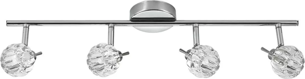 Objevte osobitou eleganci se stropním bodovým osvětlením BOMBOLA! Lesklá chromovaná konstrukce v kombinaci se skleněnými třpytivými stínidly vytváří moderní vizuální dominantu. Skvěle se hodí do ložnice, chodby nebo pracovny, kde lze jednotlivá stínidla lehce nasměrovat a přizpůsobit tak světlo konkrétnímu prostoru. Určeno pro 4 žárovky s paticí G9 a maximálním výkonem 40 W. Pro úsporu el. energie doporučujeme osadit úspornou LED žárovkou. Krytí IP20 značí vhodnost použití v interiéru.