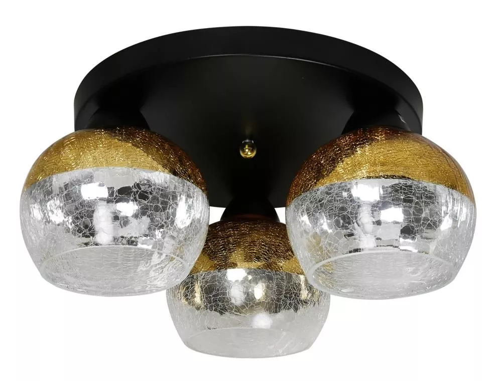 Vneste do interiéru dramatický a luxusní akcent se stropním svítidlem CROMINA. Černá kovová konstrukce se vyznačuje rameny, která nesou skleněná stínidla, kde se zlatá barva v horní části setkává s čirým sklem ve spodní části, čímž vytváří teplý a sofistikovaný kontrast. Svítidlo je ideální jako hlavní osvětlení do obývacích pokojů nebo hal, kde se stane výrazným designovým prvkem. Určeno pro 3 žárovky s paticí E27 a maximálním výkonem 60 W. Pro úsporu el. energie doporučujeme osadit úspornou LED žárovkou. Krytí IP20 značí vhodnost použití v interiéru.