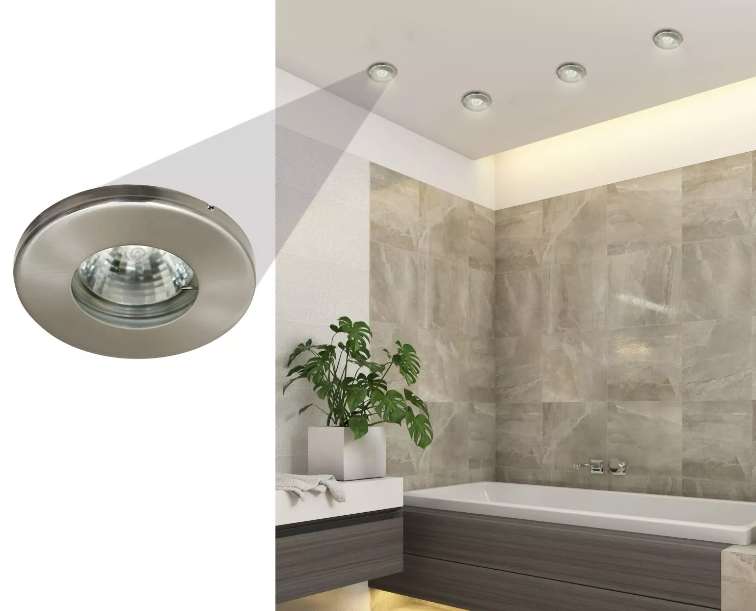 Koupelnové zápustné stropní svítidlo DERYL 5 přináší spolehlivé a bezpečné osvětlení i do vlhkých prostor. Stříbrná konstrukce s krytím IP65 je odolná proti vodě a zajišťuje, že svítidlo obstojí i v náročných podmínkách koupelen nebo sprchových koutů. Díky patici GU5.3 a maximálnímu příkonu 50 W poskytne dostatečný světelný výkon pro celkové osvětlení koupelny či jako doplňkové světlo nad vanou či sprchou. Pro úsporu el. energie doporučujeme osadit úspornou LED žárovkou.