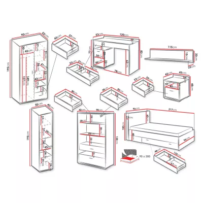 Funkční a moderní nábytek do studentského pokoje APTOS zahrnuje veškeré potřebné prvky jako je psací stůl, šatní skříň, noční stolek, závěsná polička a 2 regály pro uložení knih či studijních materiálů. Samozřejmostí je postel s výsuvným šuplíkem o spací ploše 90x200 cm. Nábytek je vybaven také praktickým LED osvětlením.