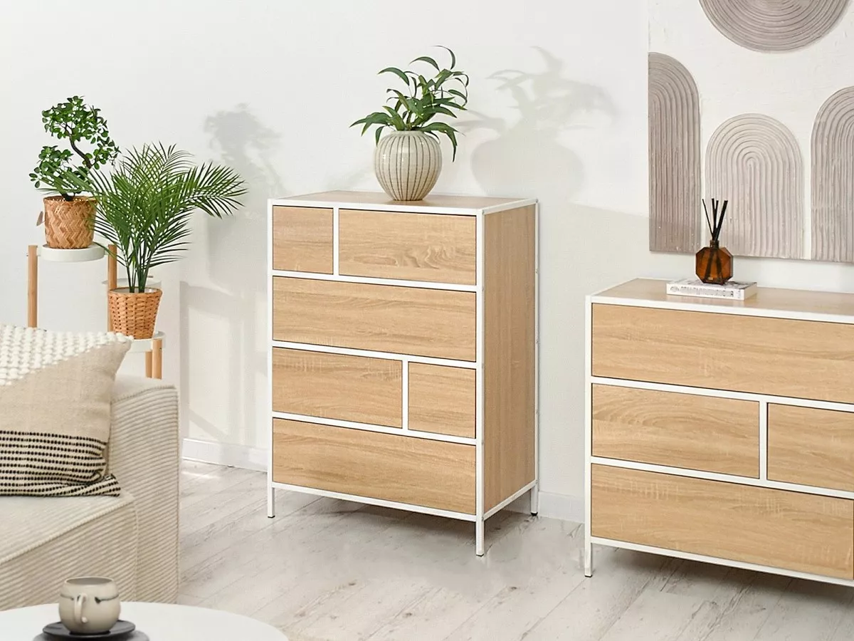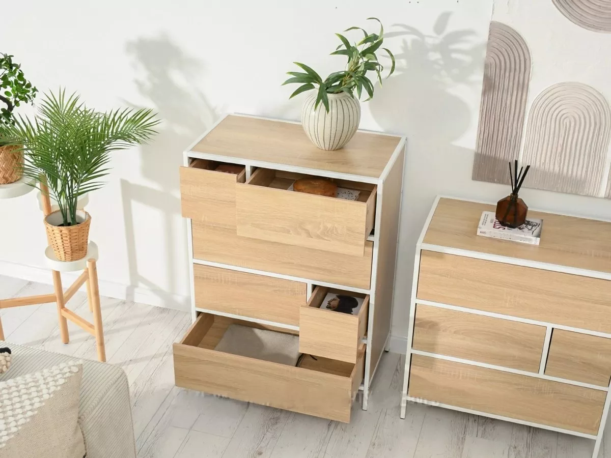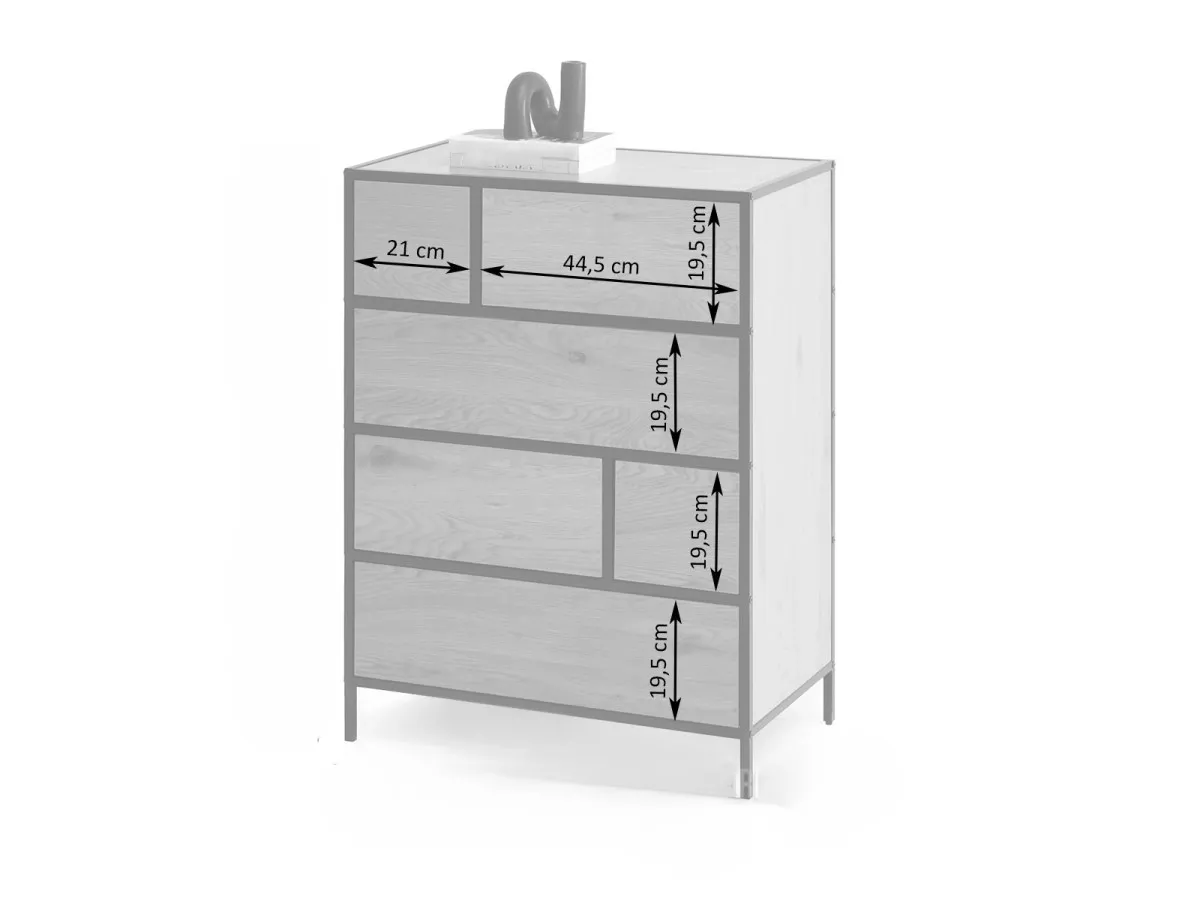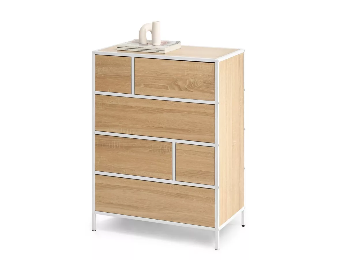 Šuplíková komoda MAIRA nabízí 6 zásuvek o různých velikostech. Zajímavým provedením komody je konstrukce, která přesahuje do míst mezi šuplíky. Konstrukce tak dodá větší stabilitu a podzvedne designové provedení celé komody.