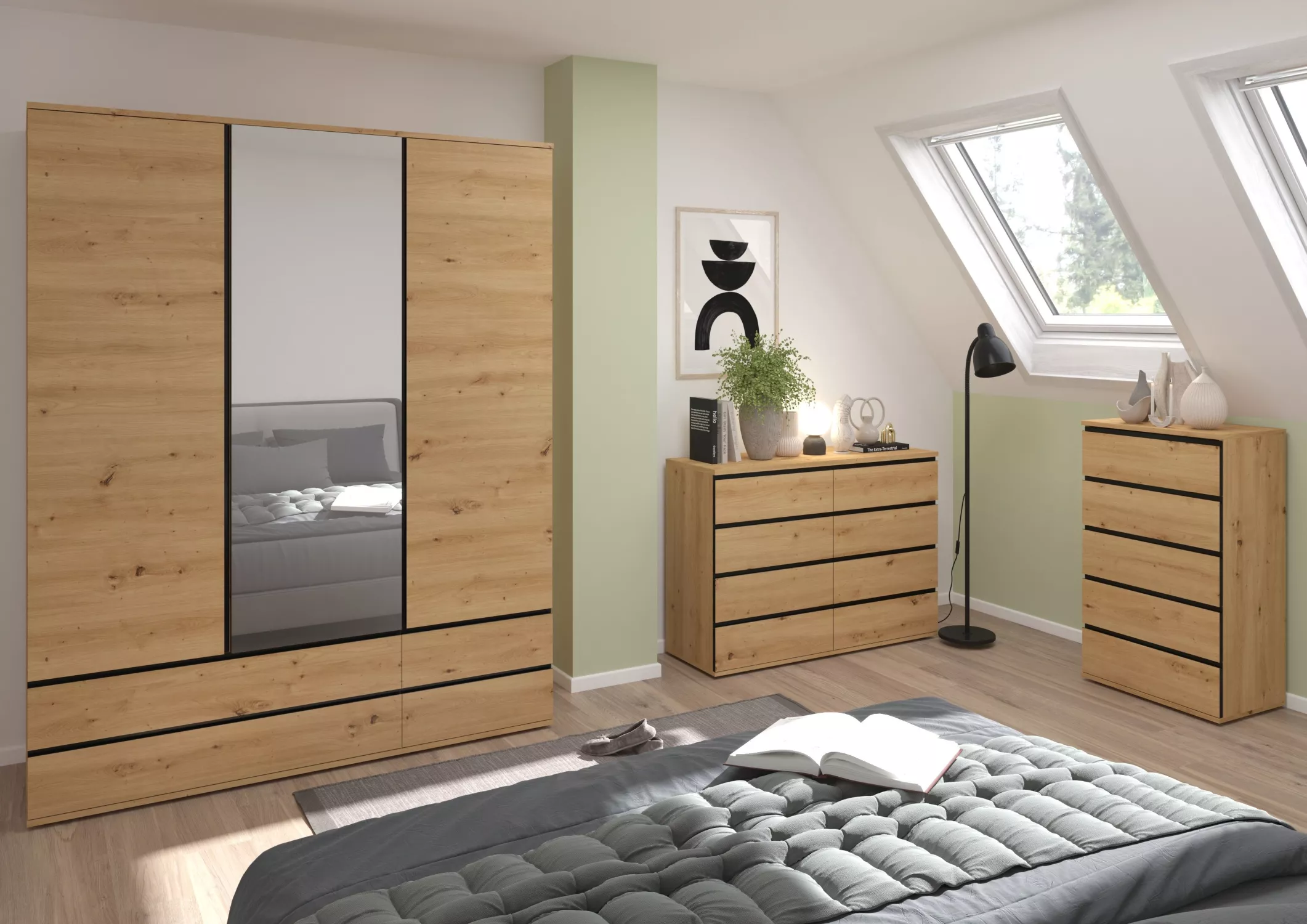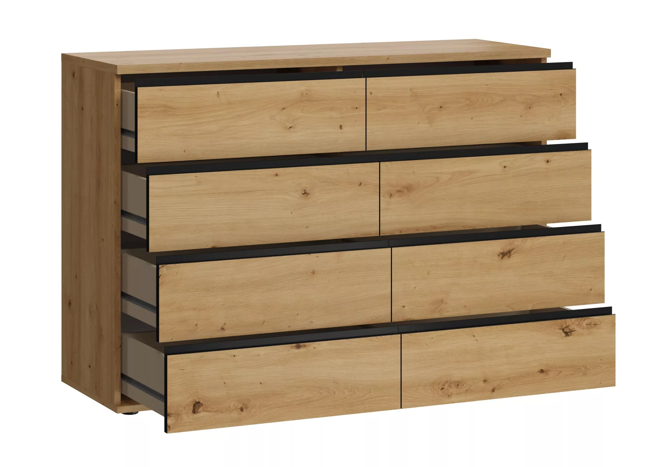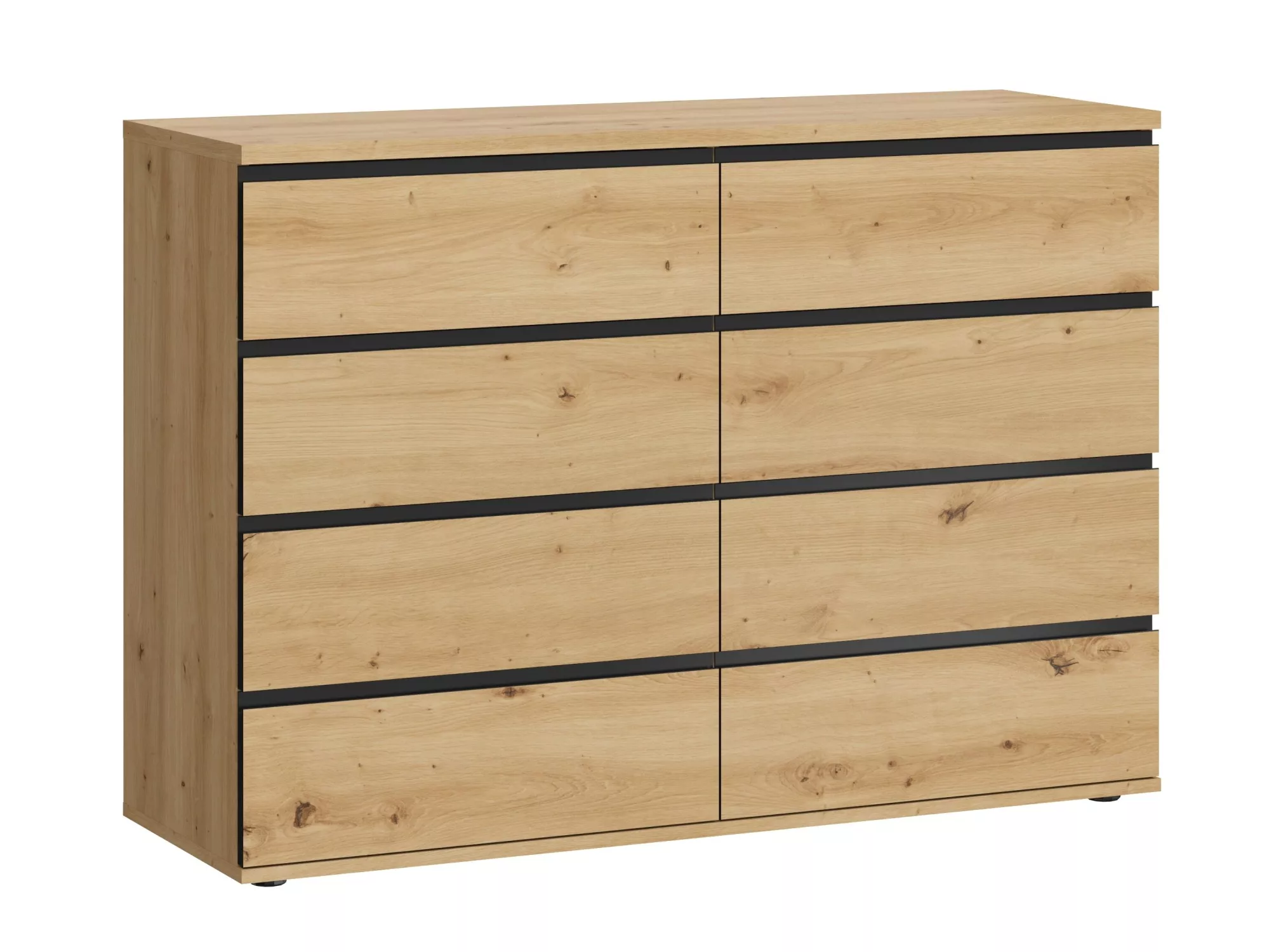 Široká šuplíková komoda HERA skvěle zapadne do moderního interiéru. Poskytuje dostatek úložného prostoru v podobě 8 prostorných šuplíků.