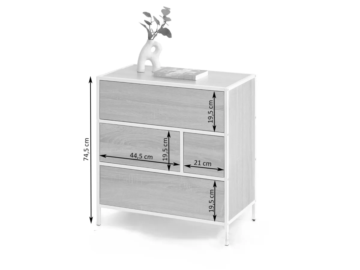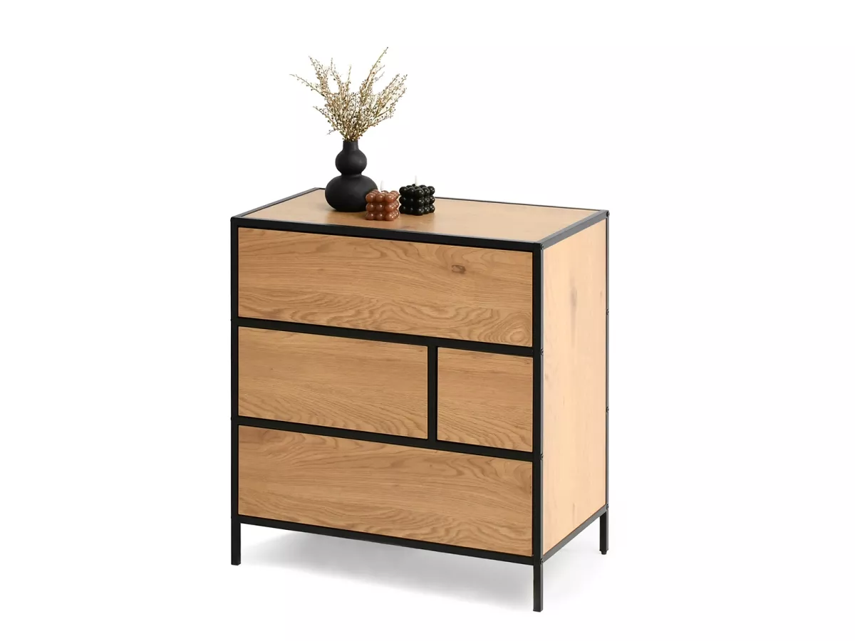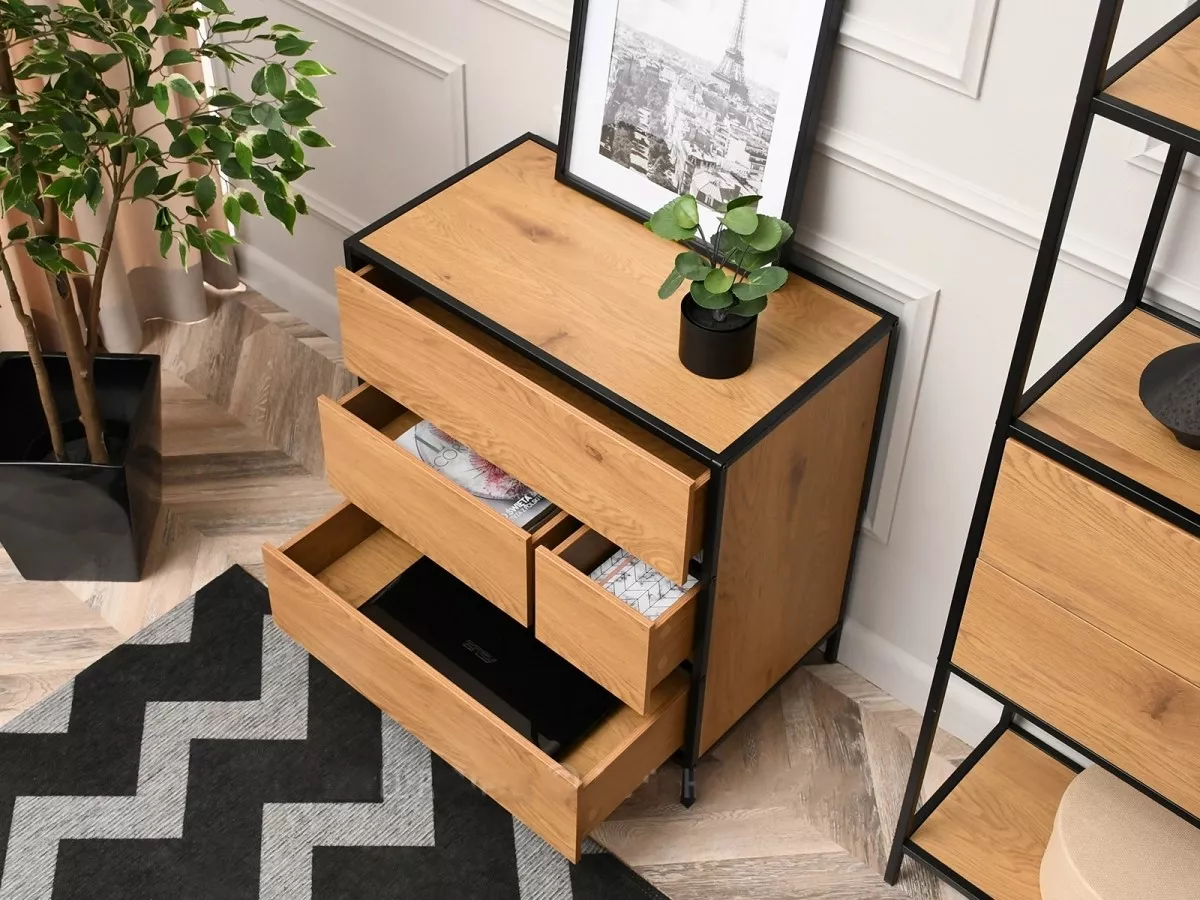 Úzká šuplíková komoda MAIRA díky svému zdobení v podobě černých kovových linií spojuje eleganci a modernost. Charakteristický dekor dřeva viditelný na povrchu dodává komodě autentičnost a zdůrazňuje její přírodní charakter.