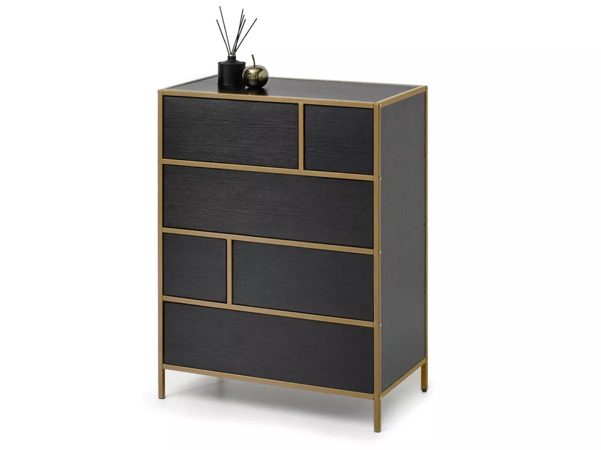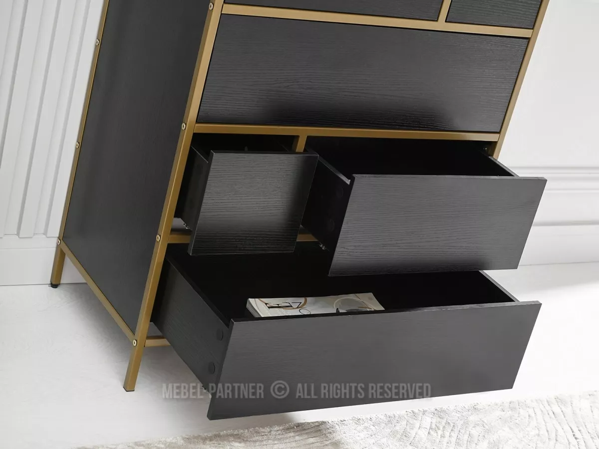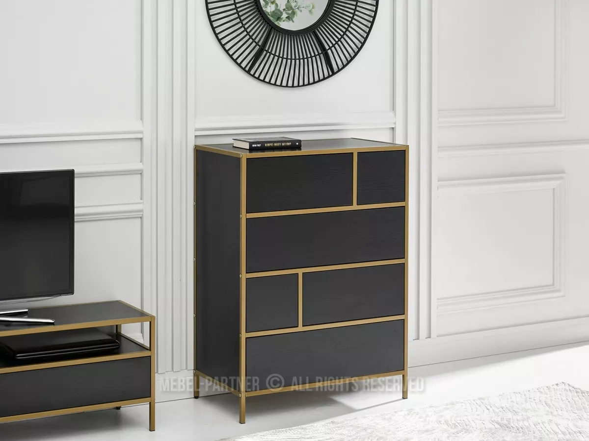 Šuplíková komoda MAIRA díky svému zdobení v podobě zlatých kovových linií spojuje eleganci a modernost. Příjemná barevná kombinace komody dodává interiéru útulný pocit.