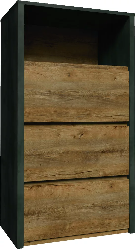 Úzká šuplíková komoda FEREIRA se vejde do všech moderních menších interiérů. Je vybavena 3 šuplíky a 1 otevřenou poličkou na odkládání drobných předmětů. Bezúchytková čela šuplíků zdůrazňují jednoduchý charakter nábytku.