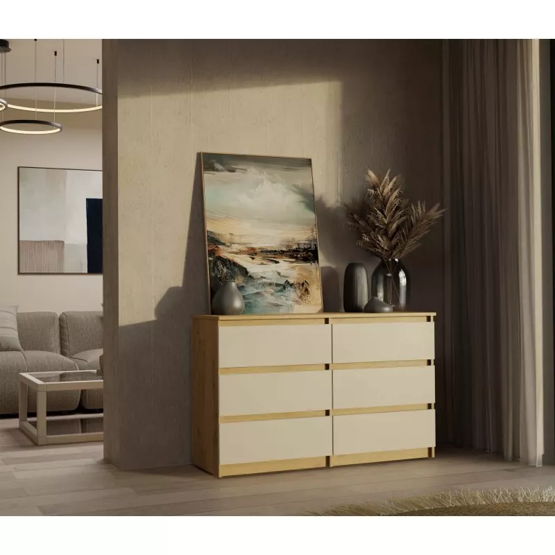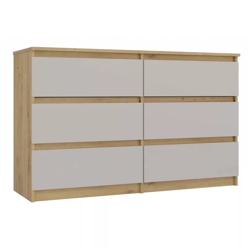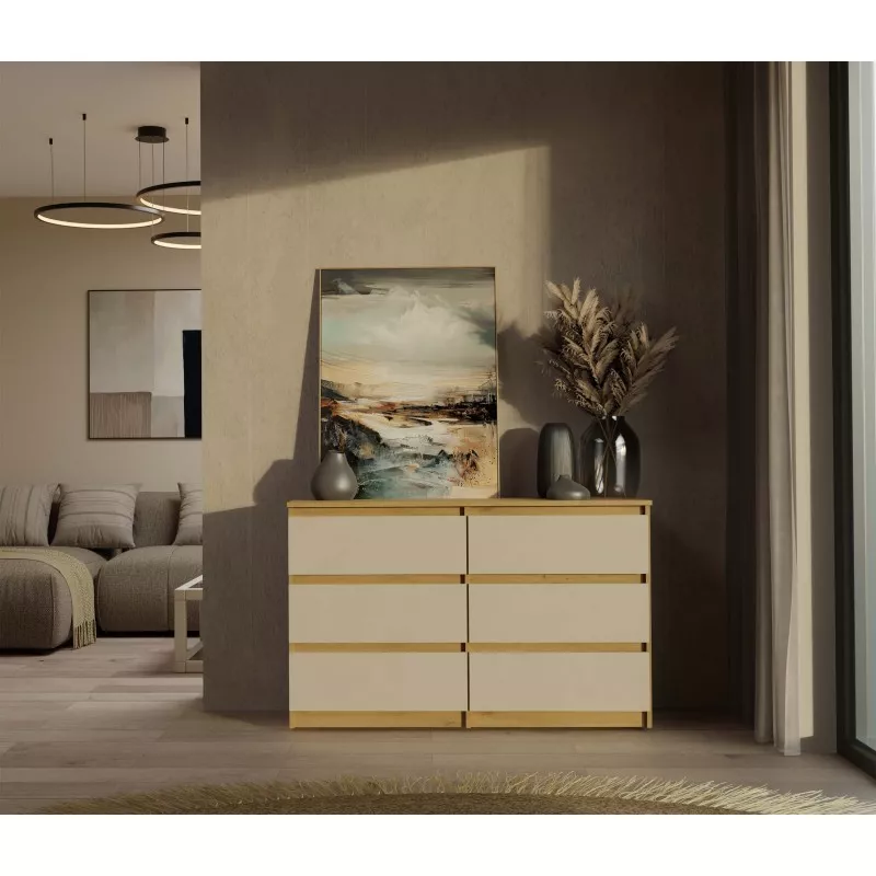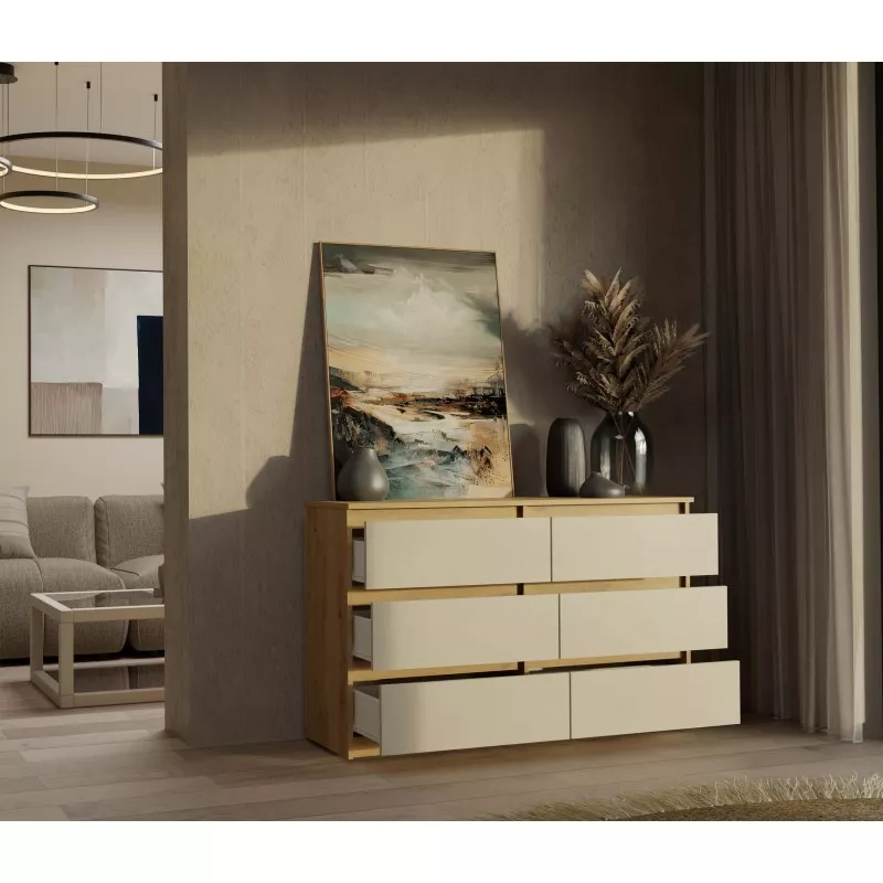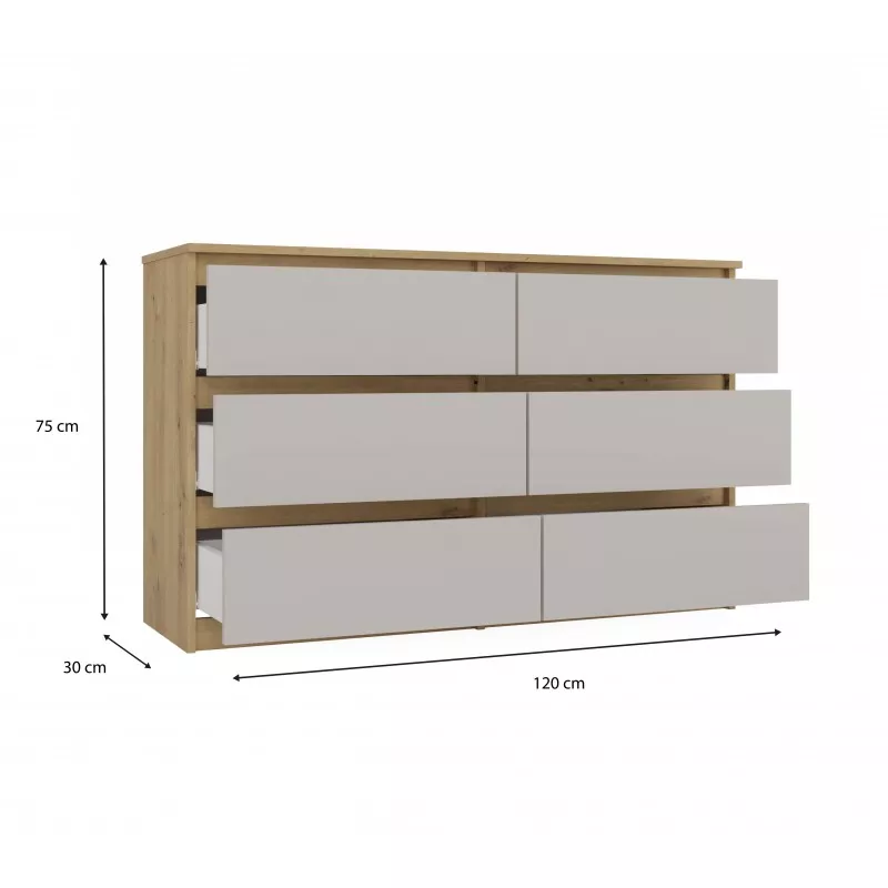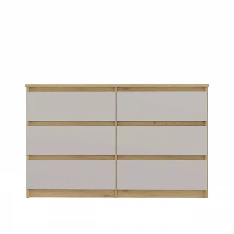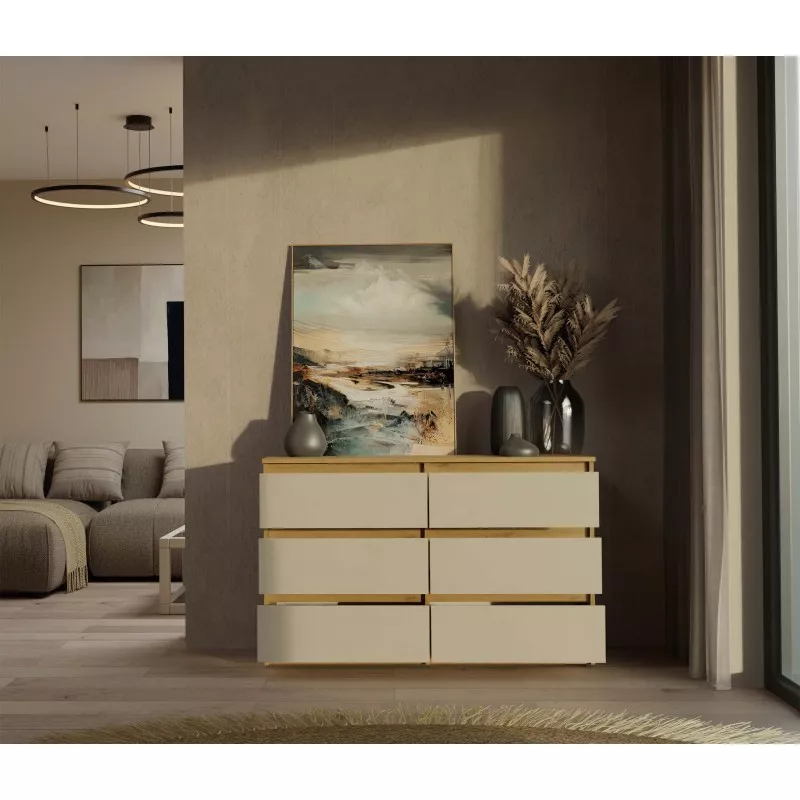 Široká zásuvková komoda TAAVI poskytuje dostatek úložného prostoru v podobě 6 prostorných zásuvek. Čela zásuvek nemají úchyty, což zajišťuje pohodlné používání a zdůrazňuje moderní charakter nábytku.